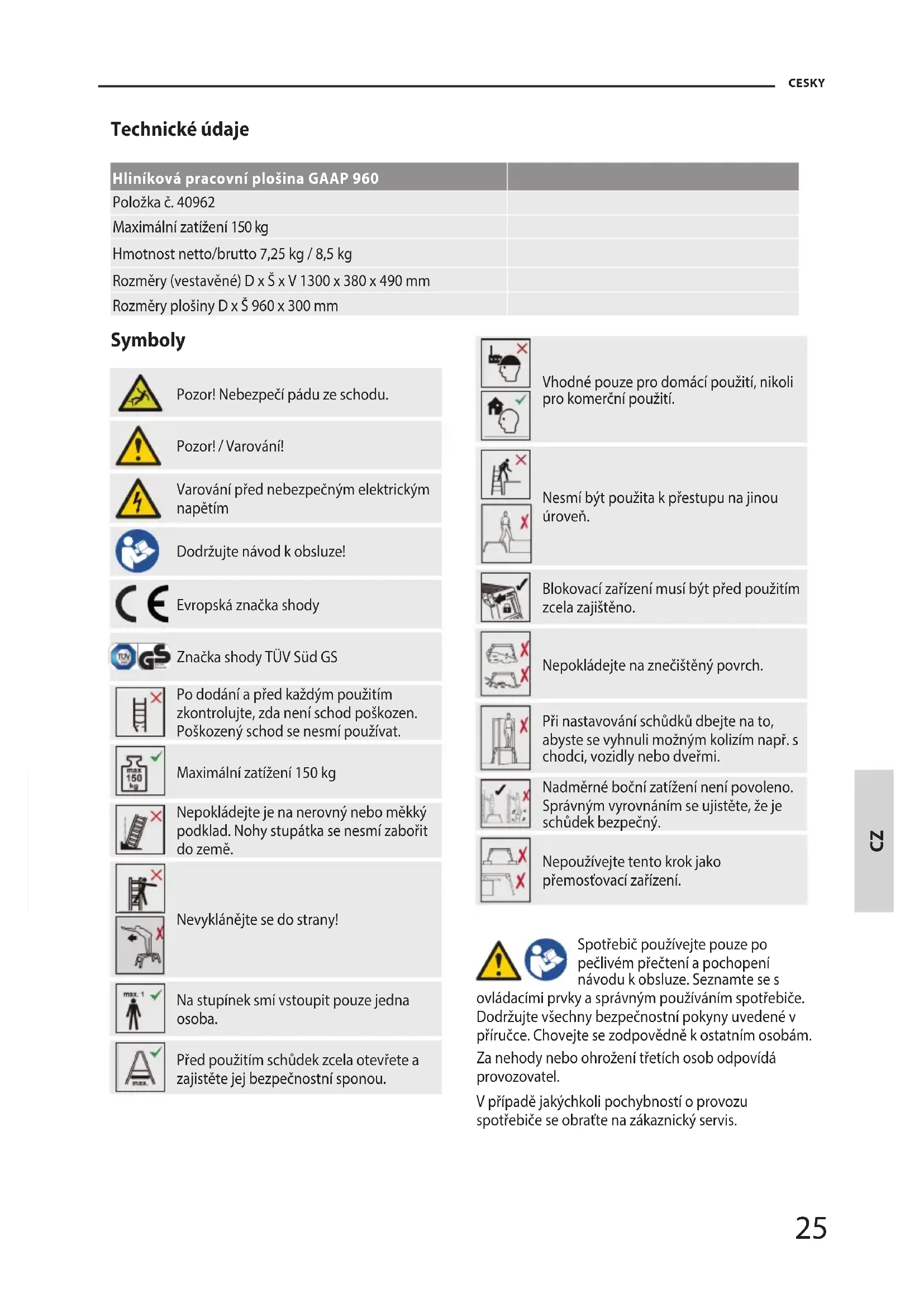 CESKY Symboly A l u m i n u m W e r k b a n k M L - 2 0 5 Pozor! Nebezpečí pádu ze schodu. Pozor! / Varování! Varování před nebezpečným elektrickým napětím Dodržujte návod k obsluze! Evropská značka shody Značka shody TÜV Süd GS A l u minu m W e r k b ank M L - 205 Po dodání a před každým použitím zkontrolujte, zda není schod poškozen. Poškozený schod se nesmí používat. A l u minu m W e r k b ank M L - 205 Maximální zatížení 150 kg A l u minu m W e r k b ank M L - 205 Nepokládejte je na nerovný nebo měkký podklad. Nohy stupátka se nesmí zabořit do země. A l u minu m W e r k b ank M L - 205 A lu mi nu m We rk ba nk M L- 20 5 Nevyklánějte se do strany! A l u minu m W e r k b ank M L - 205 Na stupínek smí vstoupit pouze jedna osoba. A l u minu m W e r k b ank M L - 205 Před použitím schůdek zcela otevřete a zajistěte jej bezpečnostní sponou. A l u minu m W e r k b ank M L - 205 A l u minu m W e r k b ank M L - 205 Vhodné pouze pro domácí použití, nikoli pro komerční použití. A lu mi nu m We rk ba nk M L- 20 5 Nesmí být použita k přestupu na jinou úroveň. A lu mi nu m We rk ba nk M L- 20 5 Blokovací zařízení musí být před použitím zcela zajištěno. A lu mi nu m We rk ba nk M L- 20 5 Nepokládejte na znečištěný povrch. A lu mi nu m We rk ba nk M L- 20 5 Při nastavování schůdků dbejte na to, abyste se vyhnuli možným kolizím např. s chodci, vozidly nebo dveřmi. Al um in um W er kb an k ML -2 05 Nadměrné boční zatížení není povoleno. Správným vyrovnáním se ujistěte, že je schůdek bezpečný. A l u mi n um We rk b an k M L - 20 5 Nepoužívejte tento krok jako přemosťovací zařízení. Spotřebič používejte pouze po pečlivém přečtení a pochopení návodu k obsluze. Seznamte se s ovládacími prvky a správným používáním spotřebiče. Dodržujte všechny bezpečnostní pokyny uvedené v příručce. Chovejte se zodpovědně k ostatním osobám. Za nehody nebo ohrožení třetích osob odpovídá provozovatel. V případě jakýchkoli pochybností o provozu spotřebiče se obraťte na zákaznický servis. Technické údaje Hliníková pracovní plošina GAAP 960 Položka č. 40962 Maximální zatížení 150 kg Hmotnost netto/brutto 7,25 kg / 8,5 kg Rozměry (vestavěné) D x Š x V 1300 x 380 x 490 mm Rozměry plošiny D x Š 960 x 300 mm26