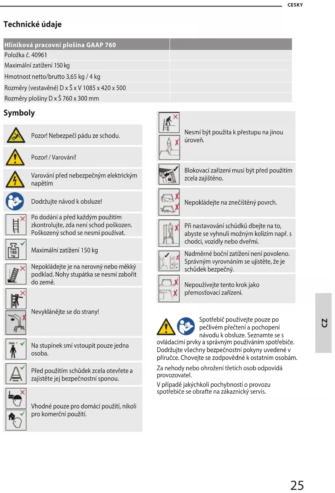 CESKY Symboly A l u m i n u m W e r k b a n k M L - 2 0 5 Pozor! Nebezpečí pádu ze schodu. Pozor! / Varování! Varování před nebezpečným elektrickým napětím Dodržujte návod k obsluze! A l u minu m W e r k b ank M L - 205 Po dodání a před každým použitím zkontrolujte, zda není schod poškozen. Poškozený schod se nesmí používat. A l u minu m W e r k b ank M L - 205 Maximální zatížení 150 kg A l u minu m W e r k b ank M L - 205 Nepokládejte je na nerovný nebo měkký podklad. Nohy stupátka se nesmí zabořit do země. A l u minu m W e r k b ank M L - 205 A lu mi nu m We rk ba nk M L- 20 5 Nevyklánějte se do strany! A l u minu m W e r k b ank M L - 205 Na stupínek smí vstoupit pouze jedna osoba. A l u minu m W e r k b ank M L - 205 Před použitím schůdek zcela otevřete a zajistěte jej bezpečnostní sponou. A l u minu m W e r k b ank M L - 205 A l u minu m W e r k b ank M L - 205 Vhodné pouze pro domácí použití, nikoli pro komerční použití. A lu mi nu m We rk ba nk M L- 20 5 Nesmí být použita k přestupu na jinou úroveň. A lu mi nu m We rk ba nk M L- 20 5 Blokovací zařízení musí být před použitím zcela zajištěno. A lu mi nu m We rk ba nk M L- 20 5 Nepokládejte na znečištěný povrch. A lu mi nu m We rk ba nk M L- 20 5 Při nastavování schůdků dbejte na to, abyste se vyhnuli možným kolizím např. s chodci, vozidly nebo dveřmi. Al um in um W er kb an k ML -2 05 Nadměrné boční zatížení není povoleno. Správným vyrovnáním se ujistěte, že je schůdek bezpečný. A l u mi n um We rk b an k M L - 20 5 Nepoužívejte tento krok jako přemosťovací zařízení. Spotřebič používejte pouze po pečlivém přečtení a pochopení návodu k obsluze. Seznamte se s ovládacími prvky a správným používáním spotřebiče. Dodržujte všechny bezpečnostní pokyny uvedené v příručce. Chovejte se zodpovědně k ostatním osobám. Za nehody nebo ohrožení třetích osob odpovídá provozovatel. V případě jakýchkoli pochybností o provozu spotřebiče se obraťte na zákaznický servis. Technické údaje Hliníková pracovní plošina GAAP 760 Položka č. 40961 Maximální zatížení 150 kg Hmotnost netto/brutto 3,65 kg / 4 kg Rozměry (vestavěné) D x Š x V 1085 x 420 x 500 Rozměry plošiny D x Š 760 x 300 mm26