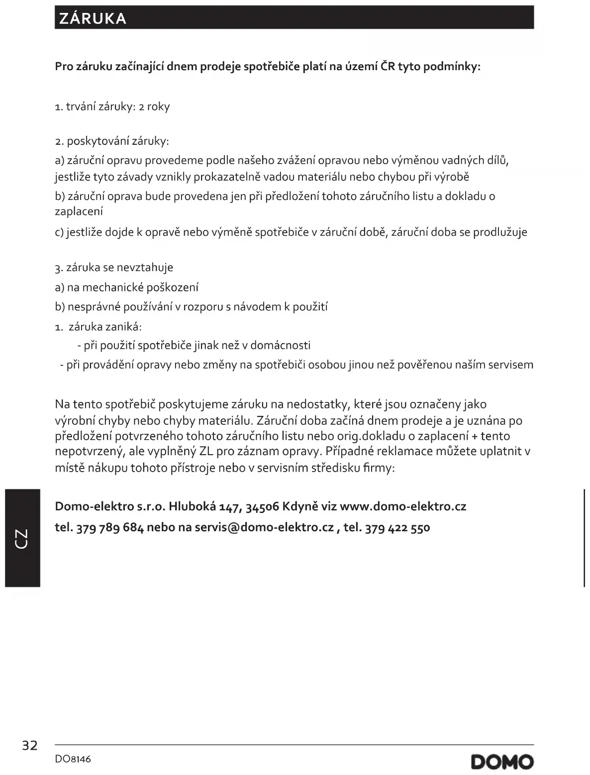 ZÁRUKA Pro záruku začínající dnem prodeje spotřebiče platí na území ČR tyto podmínky:
