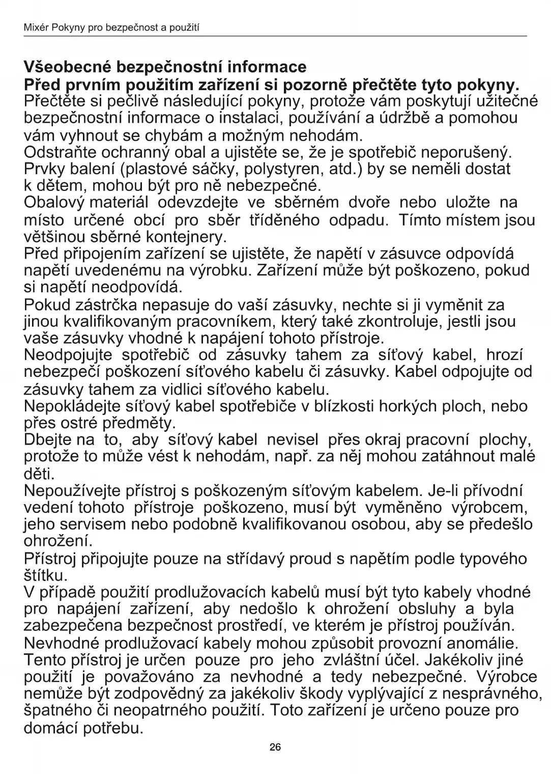 Všeobecné bezpečnostní informace Před prvním použitím zařízení si pozorně přečtěte tyto pokyny. Přečtěte si pečlivě následující pokyny, protože vám poskytují užitečné bezpečnostní informace o instalaci, používání a údržbě a pomohou vám vyhnout se chybám a možným nehodám. Odstraňte ochranný obal a ujistěte se, že je spotřebič neporušený. Prvky balení (plastové sáčky, polystyren, atd.) by se neměli dostat k dětem, mohou být pro ně nebezpečné. Obalový materiál odevzdejte ve sběrném dvoře nebo uložte na místo určené obcí pro sběr tříděného odpadu. Tímto místem jsou většinou sběrné kontejnery. Před připojením zařízení se ujistěte, že napětí v zásuvce odpovídá napětí uvedenému na výrobku. Zařízení může být poškozeno, pokud si napětí neodpovídá. Pokud zástrčka nepasuje do vaší zásuvky, nechte si ji vyměnit za jinou kvalikovaným pracovníkem, který také zkontroluje, jestli jsou vaše zásuvky vhodné k napájení tohoto přístroje. Neodpojujte spotřebič od zásuvky tahem za síťový kabel, hrozí nebezpečí poškození síťového kabelu či zásuvky. Kabel odpojujte od zásuvky tahem za vidlici síťového kabelu. Nepokládejte síťový kabel spotřebiče v blízkosti horkých ploch, nebo přes ostré předměty. Dbejte na to, aby síťový kabel nevisel přes okraj pracovní plochy, protože to může vést k nehodám, např. za něj mohou zatáhnout malé děti. Nepoužívejte přístroj s poškozeným síťovým kabelem. Je-li přívodní vedení tohoto přístroje poškozeno, musí být vyměněno výrobcem, jeho servisem nebo podobně kvalikovanou osobou, aby se předešlo ohrožení. Přístroj připojujte pouze na střídavý proud s napětím podle typového štítku. V případě použití prodlužovacích kabelů musí být tyto kabely vhodné pro napájení zařízení, aby nedošlo k ohrožení obsluhy a byla zabezpečena bezpečnost prostředí, ve kterém je přístroj používán. Nevhodné prodlužovací kabely mohou způsobit provozní anomálie. Tento přístroj je určen pouze pro jeho zvláštní účel. Jakékoliv jiné použití je považováno za nevhodné a tedy nebezpečné. Výrobce nemůže být zodpovědný za jakékoliv škody vyplývající z nesprávného, špatného či neopatrného použití. Toto zařízení je určeno pouze pro domácí potřebu.Mixér Pokyny pro bezpečnost a použití