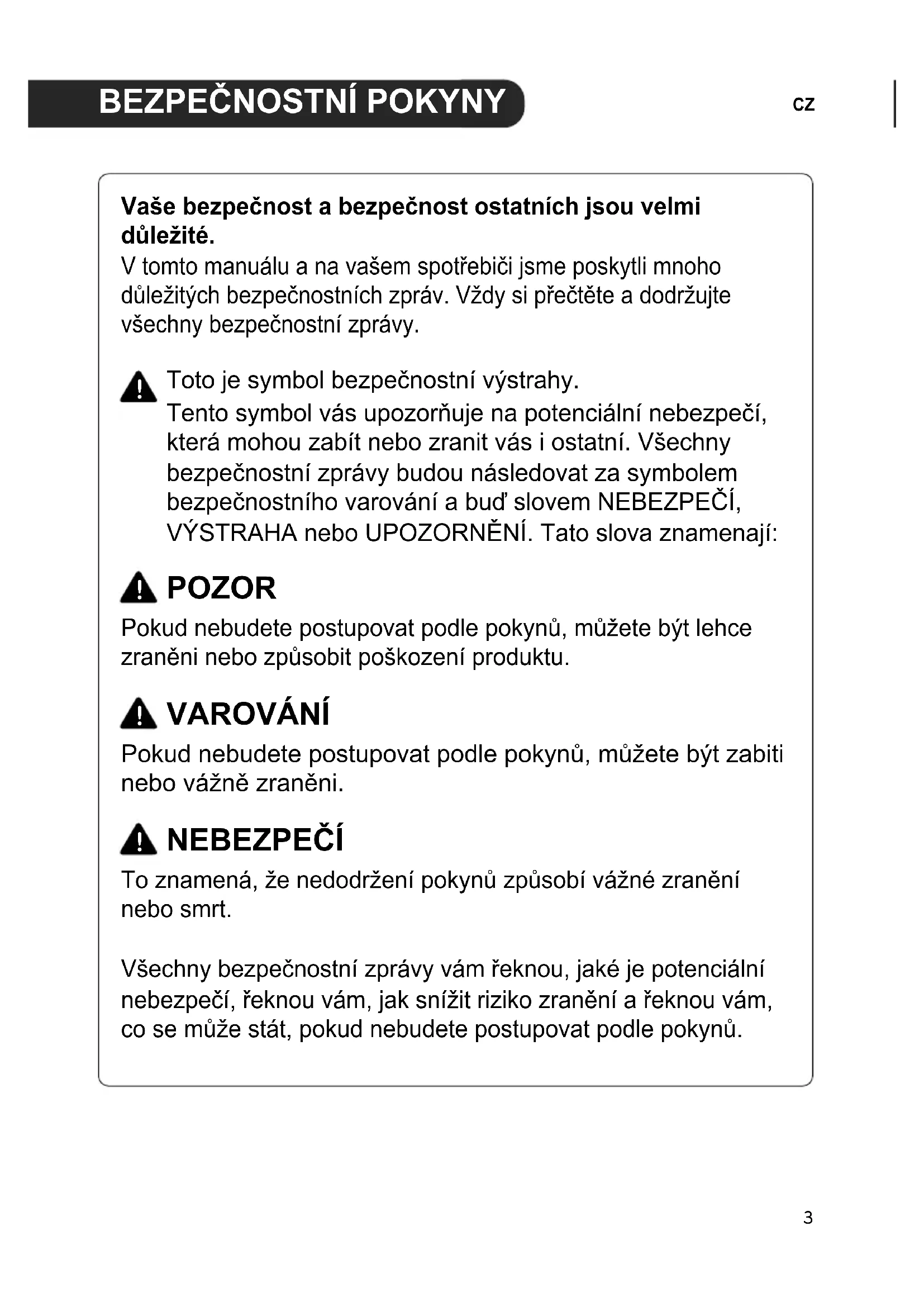 Vaše bezpečnost a bezpečnost ostatních jsou velmi důležité. V tomto manuálu a na vašem spotřebiči jsme poskytli mnoho důležitých bezpečnostních zpráv. Vždy si přečtěte a dodržujte všechny bezpečnostní zprávy. Toto je symbol bezpečnostní výstrahy. Tento symbol vás upozorňuje na potenciální nebezpečí, která mohou zabít nebo zranit vás i ostatní. Všechny bezpečnostní zprávy budou následovat za symbolem bezpečnostního varování a buď slovem NEBEZPEČÍ, VÝSTRAHA nebo UPOZORNĚNÍ. Tato slova znamenají: POZOR Pokud nebudete postupovat podle pokynů, můžete být lehce zraněni nebo způsobit poškození produktu. VAROVÁNÍ Pokud nebudete postupovat podle pokynů, můžete být zabiti nebo vážně zraněni. NEBEZPEČÍ To znamená, že nedodržení pokynů způsobí vážné zranění nebo smrt. Všechny bezpečnostní zprávy vám řeknou, jaké je potenciální nebezpečí, řeknou vám, jak snížit riziko zranění a řeknou vám, co se může stát, pokud nebudete postupovat podle pokynů.