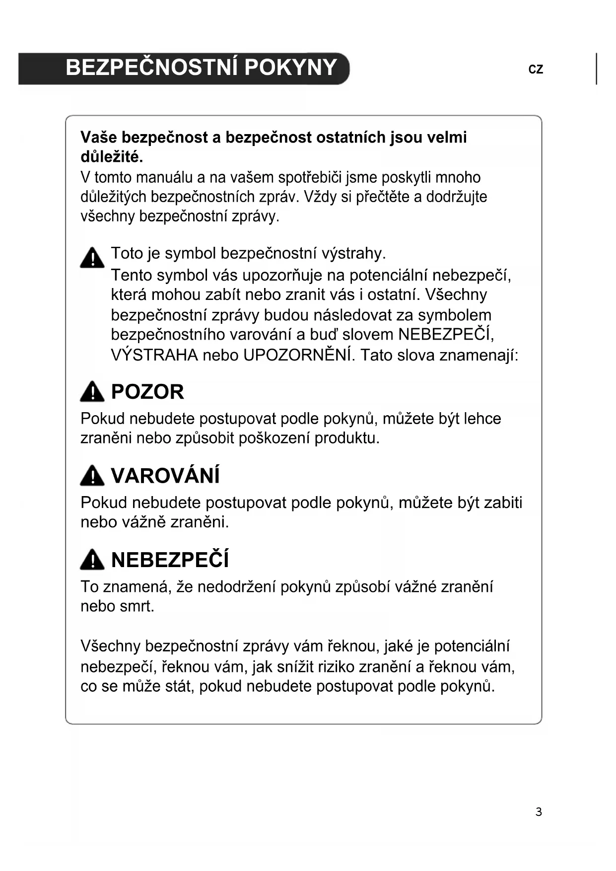 Vaše bezpečnost a bezpečnost ostatních jsou velmi důležité. V tomto manuálu a na vašem spotřebiči jsme poskytli mnoho důležitých bezpečnostních zpráv. Vždy si přečtěte a dodržujte všechny bezpečnostní zprávy. Toto je symbol bezpečnostní výstrahy. Tento symbol vás upozorňuje na potenciální nebezpečí, která mohou zabít nebo zranit vás i ostatní. Všechny bezpečnostní zprávy budou následovat za symbolem bezpečnostního varování a buď slovem NEBEZPEČÍ, VÝSTRAHA nebo UPOZORNĚNÍ. Tato slova znamenají: POZOR Pokud nebudete postupovat podle pokynů, můžete být lehce zraněni nebo způsobit poškození produktu. VAROVÁNÍ Pokud nebudete postupovat podle pokynů, můžete být zabiti nebo vážně zraněni. NEBEZPEČÍ To znamená, že nedodržení pokynů způsobí vážné zranění nebo smrt. Všechny bezpečnostní zprávy vám řeknou, jaké je potenciální nebezpečí, řeknou vám, jak snížit riziko zranění a řeknou vám, co se může stát, pokud nebudete postupovat podle pokynů.