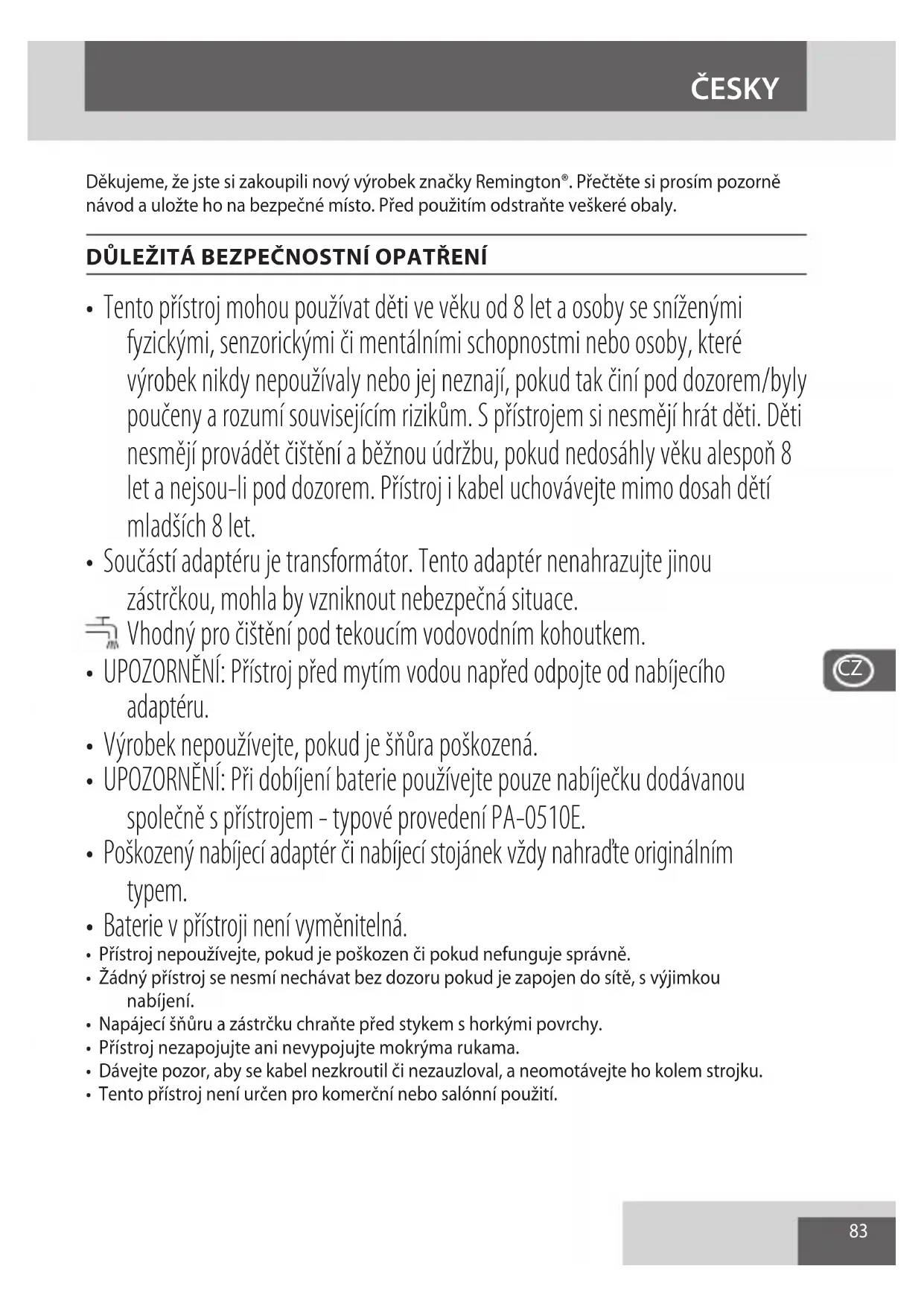 Výstupný prúd 1.0 A Výstupný výkon 5.0 W Priemerná účinnosť v aktívnom režime ≥73.7% Účinnosť na úrovni 10% - Spotreba energie v stave bez záťaže ≤0.1W SLOVENČINA83 ČESKY Děkujeme, že jste si zakoupili nový výrobek značky Remington®. Přečtěte si prosím pozorně návod a uložte ho na bezpečné místo. Před použitím odstraňte veškeré obaly. DŮLEŽITÁ BEZPEČNOSTNÍ OPATŘENÍ