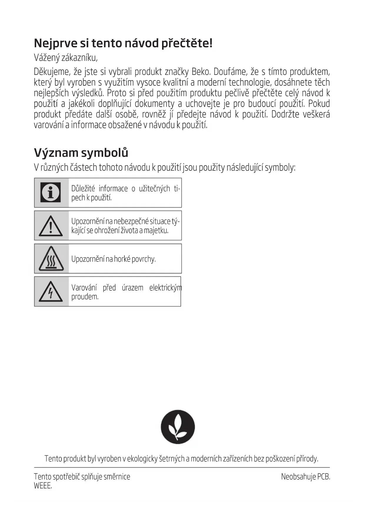 Niniejsze warunki gwarancji mają zastosowanie do Urządzeń zakupionych od dnia 01.03.2019 r. Gwarant oświadcza, że niniejsza Gwarancja jest udzielana Użytkownikowi dodatkowo i nie wyłącza, nie ogranicza ani nie zawiesza uprawnień Użytkownika wynikających z przepisów o rękojmi za wady rzeczy sprzedanej na podstawie Kodeksu cywilnego.Nejprve si tento návod přečtěte! Vážený zákazníku, Děkujeme, že jste s vybral produkt značky Beko. Doufáme, že s tímto produktem, který byl vyroben s využtím vysoce kvaltní a moderní technologe, dosáhnete těch nejlepších výsledků. Proto s před použtím produktu pečlvě přečtěte celý návod k použtí a jakékol doplňující dokumenty a uchovejte je pro budoucí použtí. Pokud produkt předáte další osobě, rovněž jí předejte návod k použtí. Dodržte veškerá varování a nformace obsažené v návodu k použtí. Význam symbolů V různých částech tohoto návodu k použtí jsou použty následující symboly: