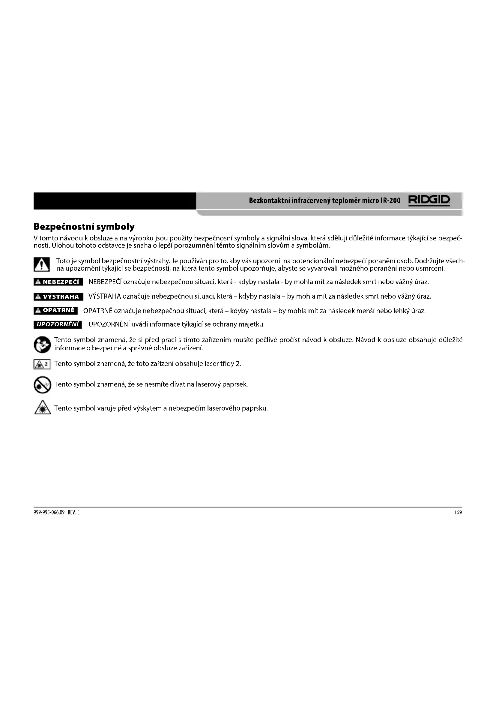 - Servis zařízení musí provádět kvalifikovaná osoba při použití identických náhradních dílů. Tím se zajistí, že bude dodržena bez- pečnost nářadí. Specifické informace o bezpečnosti VÝSTRAHA Tato část obsahuje důležité bezpečnostní informace, které se speci- álně týkají tohoto nástroje. Tato prventivní opatření si před používáním bezkontaktního infra- červeného teploměru RIDGID® micro IR-200 pečlivě pročtěte, abys- te snížili riziko požáru nebo výbuchu nebo jiného vážného osob- ního poranění. TYTO POKYNY SI ULOŽTE! Tento návod mějte uložen u přístroje, aby ho měla obsluha po ruce. Bezpečnost infračerveného teploměru