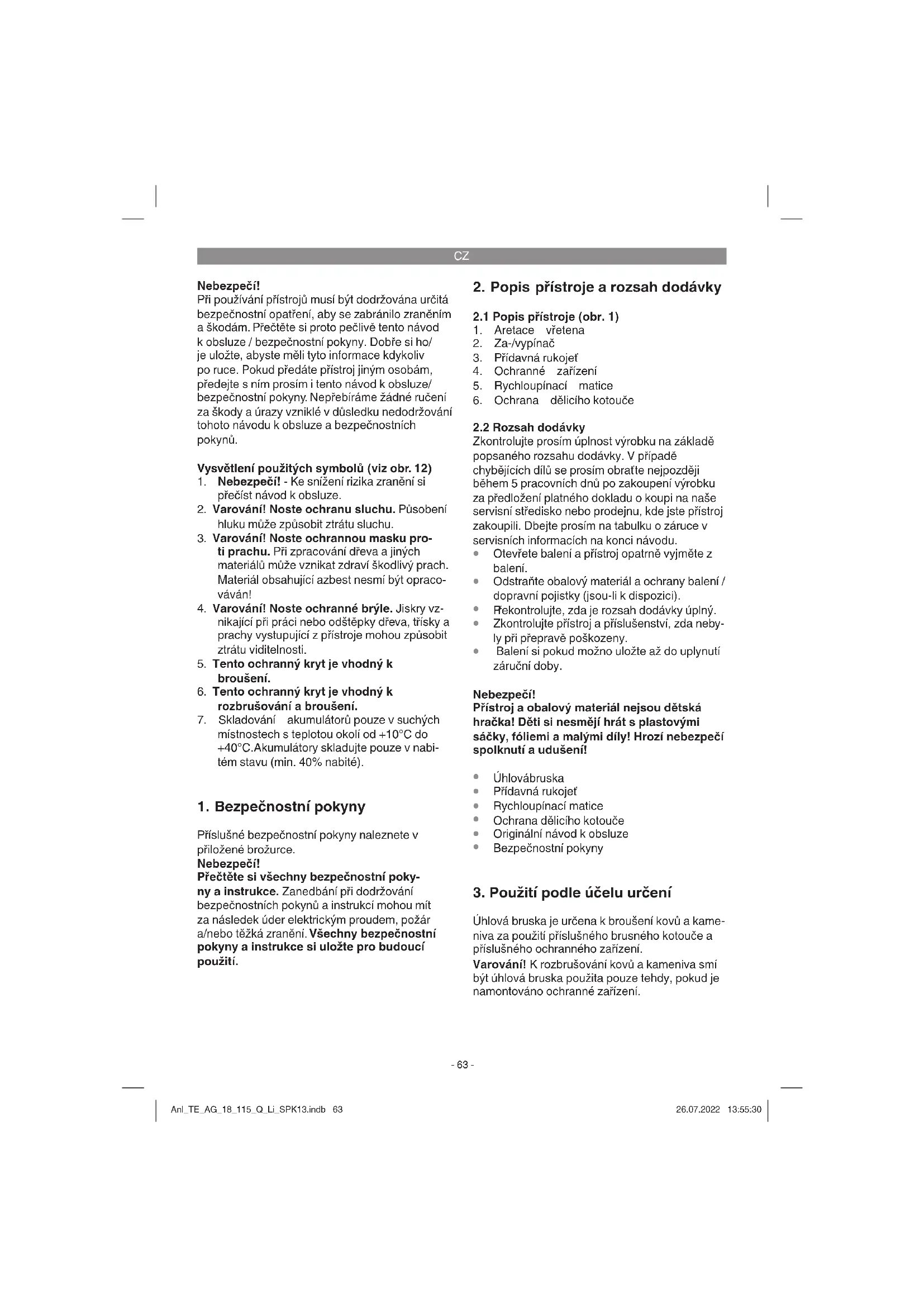 Úhlová bruska je určena k broušení kovů a kame- niva za použití příslušného brusného kotouče a příslušného ochranného zařízení. Varování! K rozbrušování kovů a kameniva smí být úhlová bruska použita pouze tehdy, pokud je namontováno ochranné zařízení. Anl_TE_AG_18_115_Q_Li_SPK13.indb 63Anl_TE_AG_18_115_Q_Li_SPK13.indb 63 26.07.2022 13:55:3026.07.2022 13:55:30CZ