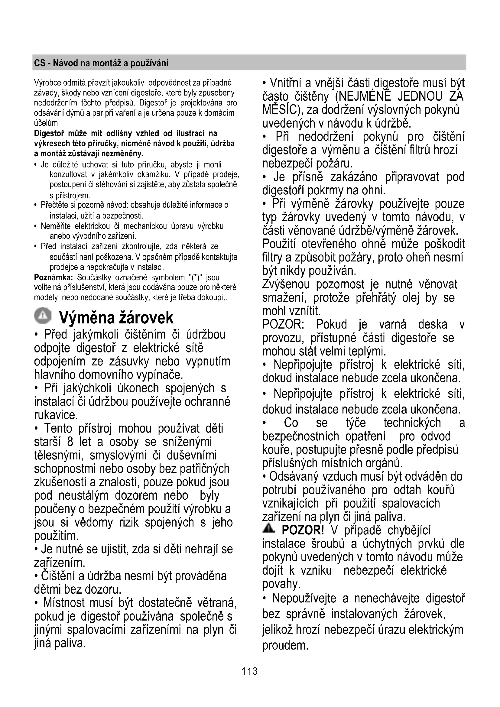 - Při výměně žárovky používejte pouze typ žárovky uvedený v tomto návodu, v části věnované údržbě/výměně žárovek. Použití otevřeného ohně může poškodit filtry a způsobit požáry, proto oheň nesmí být nikdy používán. Zvýšenou pozornost je nutné věnovat smažení, protože přehřátý olej by se mohl vznítit. POZOR: Pokud je varná deska v provozu, přístupné části digestoře se mohou stát velmi teplými.