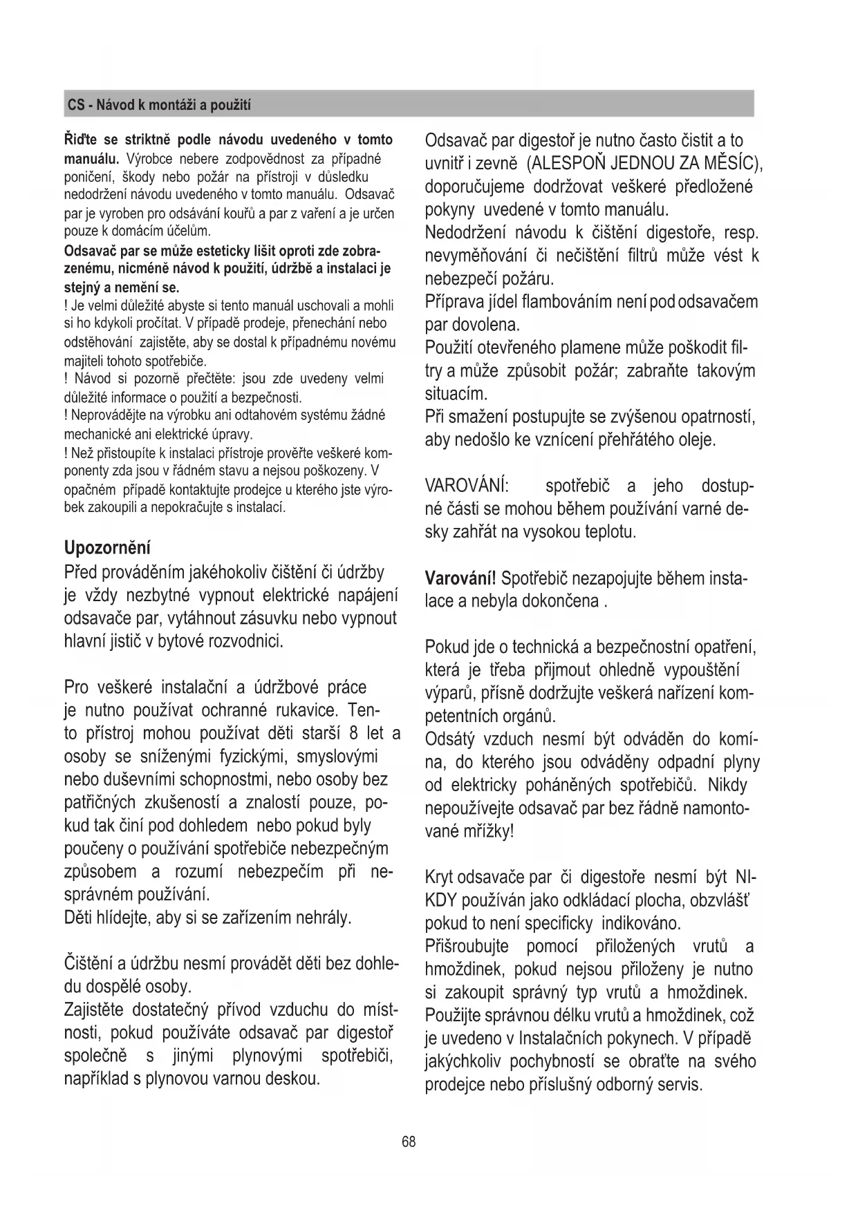 - EMC: EN 55014-1; CISPR 14-1; EN 55014-2; CISPR 14-2; CEI/EN 61000-3-2; CEI/EN 61000-3-3. Doporučení správného třídĕní ke snížení zátĕže životního prostředí: Jakmile začínáte vařit, nastavte odsavač par na mini- mální výkon či rychlost a po skončení vaření nechte ho ještě nĕkolik minut zapnutý. Můžete zvýšit výkon odsávání jen v případĕ přílišných výparů a kouře, funkci booster používejte jen v mimořádných situacích. Abyste mohli využívat a účinnĕ zajistit režim odsávání pachů a jak- mile je nutno vymĕnit uhlíkový ltr/y. Tukový ltr či odlučovač tuku je nutno čistit jen pokud je nutno. Pokud chcete optimalizovat účinnost a snižovat hlučnost, použijte maximální průměr odvodové roury uvedený v tomto manuálu. Používání Odsavač par je vyroben pro provoz s odvětráním nebo s vnitřní cirkulací vzduchu. Verze s venkovním odtahem Výpary jsou odsávány vně odvodovou rourou připevněnou k přírubĕ spojovacího prstence. Průměr odvodové roury se musí shodovat s průměrem spojovacího prstence. Pozor! Odvodová roura není dodávána a je nutno si ji objednat či zakoupit. Na vodorovných úsecích roury je třeba zajistit mírný spád (cca 10°) stoupající směrem k vyústění do vnější atmosféry. Má-li odsavač par uhlíkové ltrační vložky, je nutno je vytáhnout.70 Filtrační verze Nasávaný vzduch je odloučený od tuků předtím, než je veden zpĕt do místnosti. Abyste mohli použít tuto verzi odsavače, je nutno instalovat dodatečný ltrační systém s aktivními uhlíky. Poznámka: recyklovaný vzduch uhlíkovými l- try je vypouštĕn odvodní rourou s výustkou do kuchynĕ na boční stranu kuchyňské skříňky. Instalace Poznámka: instalaci je nutno provést tak, aby mohl být neustále zajištěn přístup k odsavači par a k elektronickým komponentům kvůli tech- nickým nebo servisním zásahům. UPOZORNĚNÍ: kovovou krabičku s elektro- nickými komponenty položte 65 cm dál od varné desky a ne blíže, nebo alespoň 65 cm vzdálenou od bodu odsávání odsavače par. Doporučení: Doporučujeme instalovat kovo- vou krabičku s elektronickými komponenty ve výšce alespoň 10 cm od podlahy a tak, aby byla dostatečné vzdálenosti od všech tepelných zdrojů (např.: bok trouby nebo povrch plotýnek). Jestliže je v pokynech k instalaci spotřebiče určena větší vzdálenost než uvedená, je nutné ji dodržet a postupovat dle příslušných pokynů. Elektrické spojení Elektrické připojení odsavače par smí provádět pouze k tomu kvalikovaný specializovaný per- sonál. Zkontrolujte, zda napětí uvedené na typovém štítku spotřebiče odpovídá napětí v síti. Pokud je odsavač par vybaven zástrčkou, připojte ho i po instalaci k snadno přístupné zásuvce odpo- vídající platným normám. Pokud není vybaven zástrčkou (přímé napojení do sítě), nebo zásu- vka není umístěna na snadno přístupném místě, použijte dvoupólový vypínač odpovídající plat- ným předpisům, který zajistí úplné odpojení od sítě v případě přepětí kategorie III v souladu s instalačními předpisy. Pozor! Před napěťovým kontaktem odsavače par a funkční kontrolou, zkontrolujte zda kabel byl zasunut v příslušné poloze. Montáž Po vybalení spotřebiče zkontrolujte, zda nedošlo k jeho poškození při přepravě, zda veškeré komponenty nejsou poškozeny. V případě problémů kontaktujte prodejce nebo servisní středisko a nepokračujte v montáži. Tento návod je opatřen důležitými zprávami ohledně bezpečnosti, které je třeba si přečíst a vždy se podle nich řídit. Použijte odvodovou rouru maximální délky 5 metrů a ne delší.