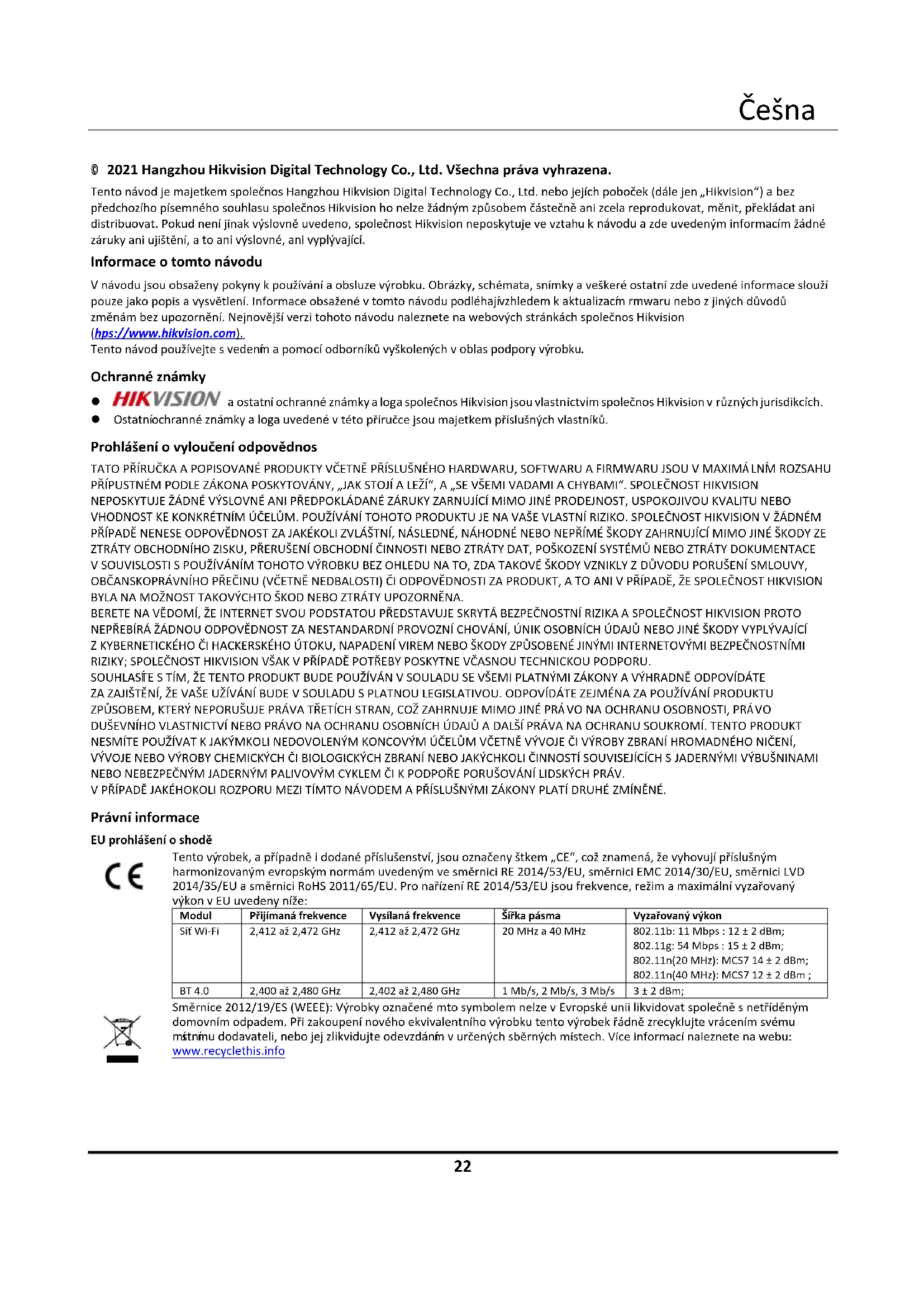 © 2021 Hangzhou Hikvision Digital Technology Co., Ltd. Všechna práva vyhrazena. Tento návod je majetkem společnosti Hangzhou Hikvision Digital Technology Co., Ltd. nebo jejích poboček (dále jen „Hikvision“) a bez předchozího písemného souhlasu společnosti Hikvision ho nelze žádným způsobem částečně ani zcela reprodukovat, měnit, překládat ani distribuovat. Pokud není jinak výslovně uvedeno, společnost Hikvision neposkytuje ve vztahu k návodu a zde uvedeným informacím žádné záruky ani ujištění, a to ani výslovné, ani vyplývající. Informace o tomto návodu V návodu jsou obsaženy pokyny k používání a obsluze výrobku. Obrázky, schémata, snímky a veškeré ostatní zde uvedené informace slouží pouze jako popis a vysvětlení. Informace obsažené v tomto návodu podléhají vzhledem k aktualizacím firmwaru nebo z jiných důvodů změnám bez upozornění. Nejnovější verzi tohoto návodu naleznete na webových stránkách společnosti Hikvision (https://www.hikvision.com). Tento návod používejte s vedením a pomocí odborníků vyškolených v oblasti podpory výrobku. Ochranné známky a ostatní ochranné známky a loga společnosti Hikvision jsou vlastnictvím společnosti Hikvision v různých jurisdikcích. Ostatní ochranné známky a loga uvedené v této příručce jsou majetkem příslušných vlastníků. Prohlášení o vyloučení odpovědnosti TATO PŘÍRUČKA A POPISOVANÉ PRODUKTY VČETNĚ PŘÍSLUŠNÉHO HARDWARU, SOFTWARU A FIRMWARU JSOU V MAXIMÁLNÍM ROZSAHU PŘÍPUSTNÉM PODLE ZÁKONA POSKYTOVÁNY, „JAK STOJÍ A LEŽÍ“, A „SE VŠEMI VADAMI A CHYBAMI“. SPOLEČNOST HIKVISION NEPOSKYTUJE ŽÁDNÉ VÝSLOVNÉ ANI PŘEDPOKLÁDANÉ ZÁRUKY ZARNUJÍCÍ MIMO JINÉ PRODEJNOST, USPOKOJIVOU KVALITU NEBO VHODNOST KE KONKRÉTNÍM ÚČELŮM. POUŽÍVÁNÍ TOHOTO PRODUKTU JE NA VAŠE VLASTNÍ RIZIKO. SPOLEČNOST HIKVISION V ŽÁDNÉM PŘÍPADĚ NENESE ODPOVĚDNOST ZA JAKÉKOLI ZVLÁŠTNÍ, NÁSLEDNÉ, NÁHODNÉ NEBO NEPŘÍMÉ ŠKODY ZAHRNUJÍCÍ MIMO JINÉ ŠKODY ZE ZTRÁTY OBCHODNÍHO ZISKU, PŘERUŠENÍ OBCHODNÍ ČINNOSTI NEBO ZTRÁTY DAT, POŠKOZENÍ SYSTÉMŮ NEBO ZTRÁTY DOKUMENTACE V SOUVISLOSTI S POUŽÍVÁNÍM TOHOTO VÝROBKU BEZ OHLEDU NA TO, ZDA TAKOVÉ ŠKODY VZNIKLY Z DŮVODU PORUŠENÍ SMLOUVY, OBČANSKOPRÁVNÍHO PŘEČINU (VČETNĚ NEDBALOSTI) ČI ODPOVĚDNOSTI ZA PRODUKT, A TO ANI V PŘÍPADĚ, ŽE SPOLEČNOST HIKVISION BYLA NA MOŽNOST TAKOVÝCHTO ŠKOD NEBO ZTRÁTY UPOZORNĚNA. BERETE NA VĚDOMÍ, ŽE INTERNET SVOU PODSTATOU PŘEDSTAVUJE SKRYTÁ BEZPEČNOSTNÍ RIZIKA A SPOLEČNOST HIKVISION PROTO NEPŘEBÍRÁ ŽÁDNOU ODPOVĚDNOST ZA NESTANDARDNÍ PROVOZNÍ CHOVÁNÍ, ÚNIK OSOBNÍCH ÚDAJŮ NEBO JINÉ ŠKODY VYPLÝVAJÍCÍ Z KYBERNETICKÉHO ČI HACKERSKÉHO ÚTOKU, NAPADENÍ VIREM NEBO ŠKODY ZPŮSOBENÉ JINÝMI INTERNETOVÝMI BEZPEČNOSTNÍMI RIZIKY; SPOLEČNOST HIKVISION VŠAK V PŘÍPADĚ POTŘEBY POSKYTNE VČASNOU TECHNICKOU PODPORU. SOUHLASÍTE S TÍM, ŽE TENTO PRODUKT BUDE POUŽÍVÁN V SOULADU SE VŠEMI PLATNÝMI ZÁKONY A VÝHRADNĚ ODPOVÍDÁTE ZA ZAJIŠTĚNÍ, ŽE VAŠE UŽÍVÁNÍ BUDE V SOULADU S PLATNOU LEGISLATIVOU. ODPOVÍDÁTE ZEJMÉNA ZA POUŽÍVÁNÍ PRODUKTU ZPŮSOBEM, KTERÝ NEPORUŠUJE PRÁVA TŘETÍCH STRAN, COŽ ZAHRNUJE MIMO JINÉ PRÁVO NA OCHRANU OSOBNOSTI, PRÁVO DUŠEVNÍHO VLASTNICTVÍ NEBO PRÁVO NA OCHRANU OSOBNÍCH ÚDAJŮ A DALŠÍ PRÁVA NA OCHRANU SOUKROMÍ. TENTO PRODUKT NESMÍTE POUŽÍVAT K JAKÝMKOLI NEDOVOLENÝM KONCOVÝM ÚČELŮM VČETNĚ VÝVOJE ČI VÝROBY ZBRANÍ HROMADNÉHO NIČENÍ, VÝVOJE NEBO VÝROBY CHEMICKÝCH ČI BIOLOGICKÝCH ZBRANÍ NEBO JAKÝCHKOLI ČINNOSTÍ SOUVISEJÍCÍCH S JADERNÝMI VÝBUŠNINAMI NEBO NEBEZPEČNÝM JADERNÝM PALIVOVÝM CYKLEM ČI K PODPOŘE PORUŠOVÁNÍ LIDSKÝCH PRÁV. V PŘÍPADĚ JAKÉHOKOLI ROZPORU MEZI TÍMTO NÁVODEM A PŘÍSLUŠNÝMI ZÁKONY PLATÍ DRUHÉ ZMÍNĚNÉ. Právní informace EU prohlášení o shodě