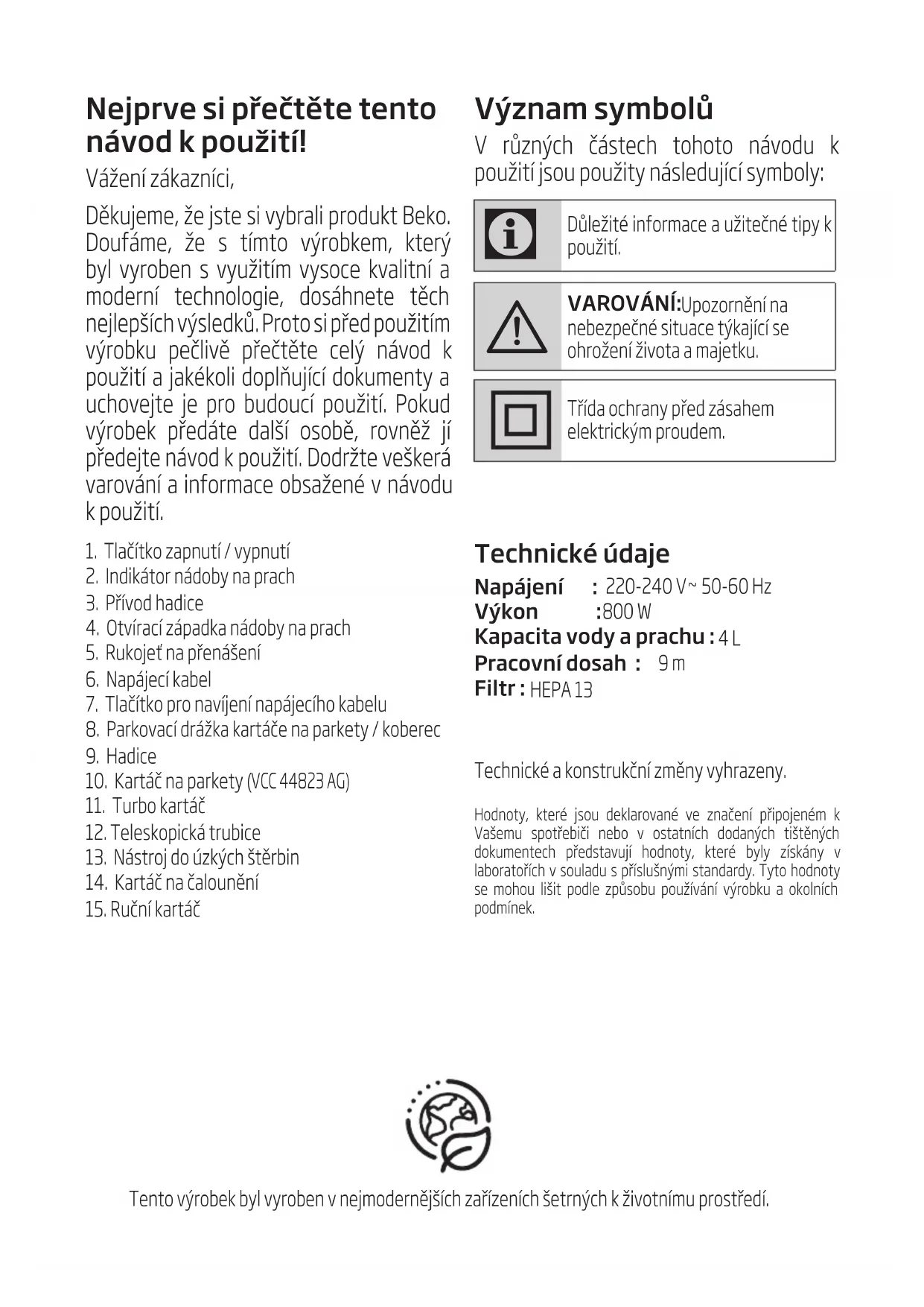 VCC 44823 AG - Vysavač BEKO - Bezplatný návod k obsluze
