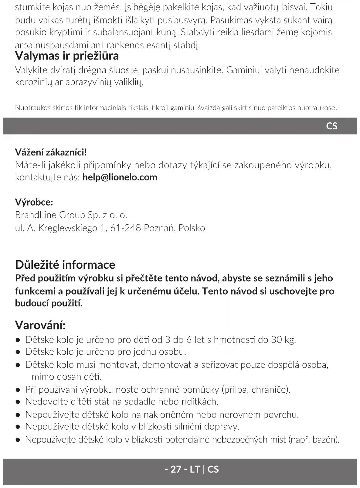- Nepoužívejte dětské kolo v blízkos potenciálně nebezpečných míst (např. bazén). stumkite kojas nuo žemės. Įsibėgėję pakelkite kojas, kad važiuotų laisvai. Tokiu būdu vaikas turėtų išmok išlaiky pusiausvyrą. Pasukimas vyksta sukant vairą posūkio krypmi ir subalansuojant kūną. Stabdy reikia liesdami žemę kojomis arba nuspausdami ant rankenos esan stabdį. Valymas ir priežiūra Valykite dvira drėgna šluoste, paskui nusausinkite. Gaminiui valy nenaudokite korozinių ar abrazyvinių valiklių. Nuotraukos skirtos k informaciniais kslais, kroji gaminių išvaizda gali skirs nuo pateiktos nuotraukose.‑ 28 ‑CS
