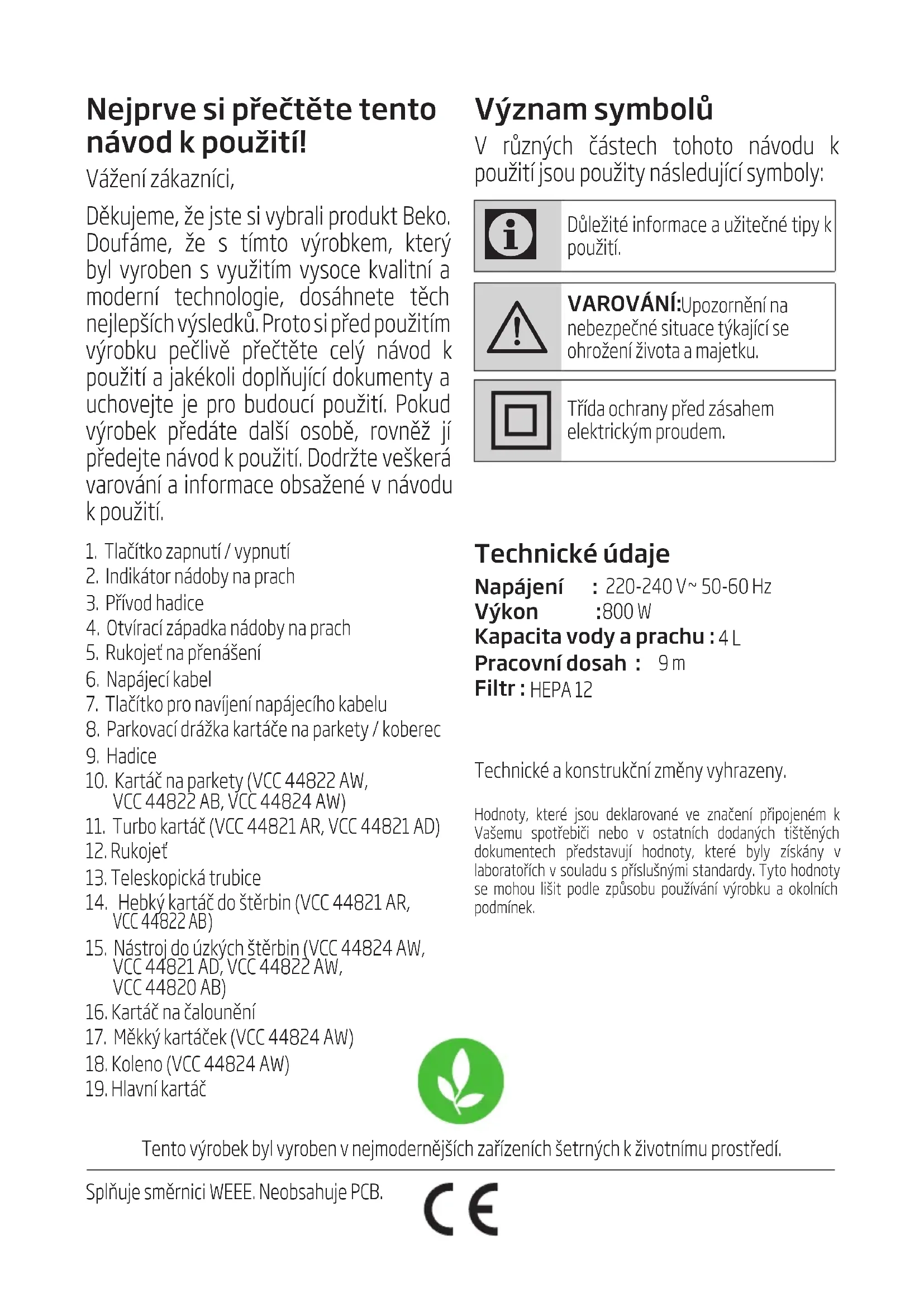VCC 44824 AW - Vysavač BEKO - Bezplatný návod k obsluze