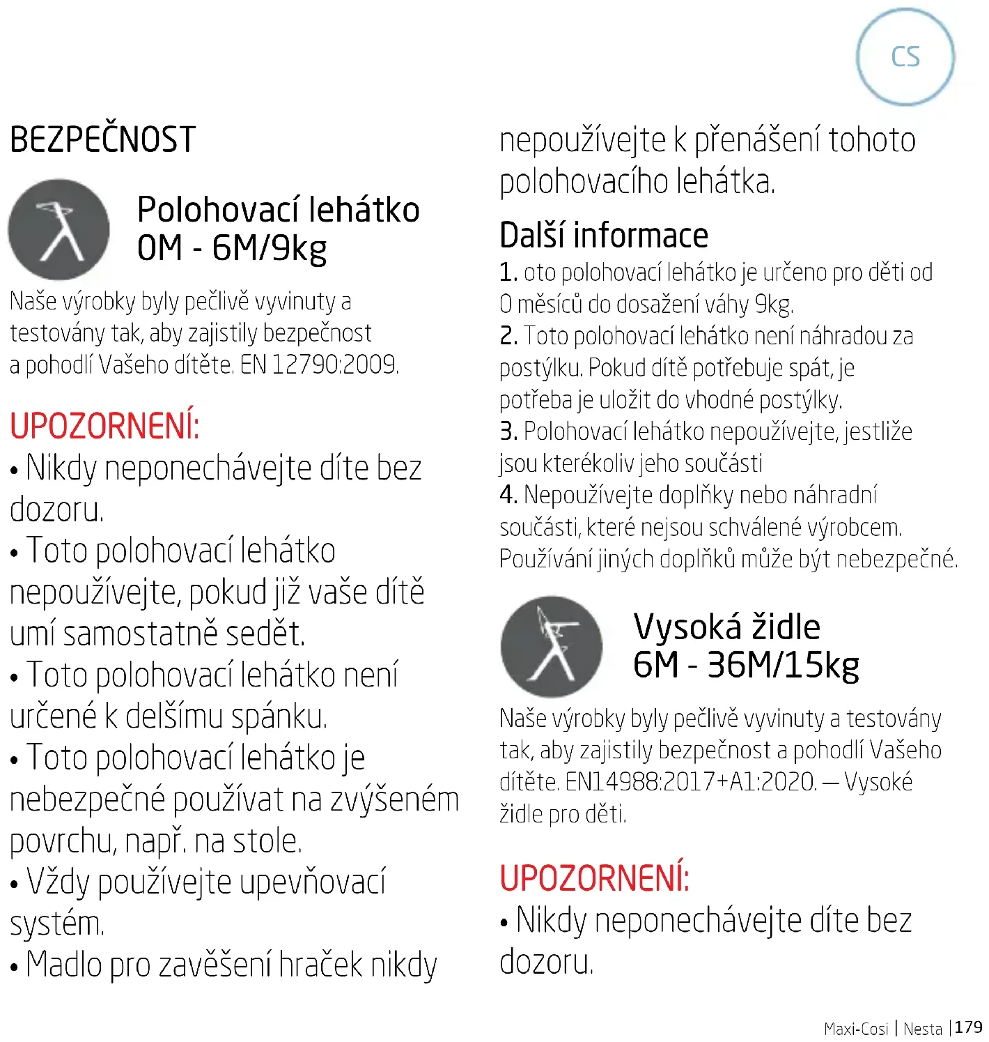 BEZPEČNOST Polohovací lehátko 0M - 6M/9kg Naše výrobky byly pečlivě vyvinuty a testovány tak, aby zajistily bezpečnost a pohodlí Vašeho dítěte. EN 12790:2009. UPOZORNENÍ: