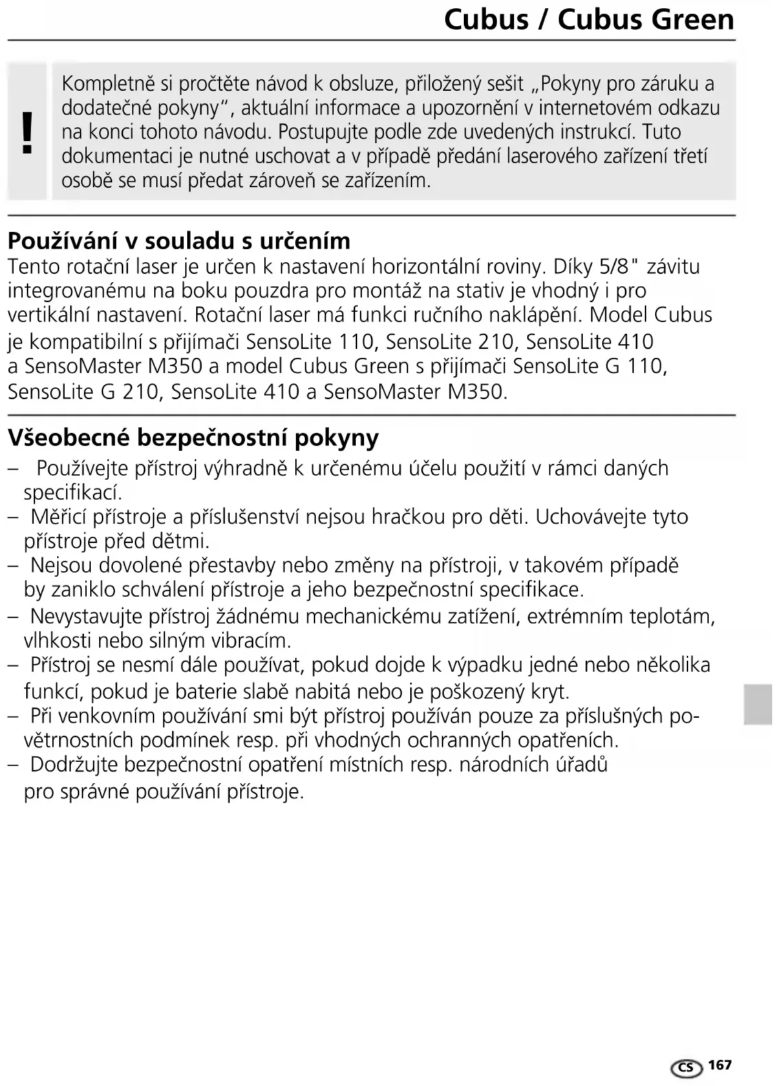 Všeobecné bezpečnostní pokyny – Používejte přístroj výhradně k určenému účelu použití v rámci daných specikací. – Měřicí přístroje a příslušenství nejsou hračkou pro děti. Uchovávejte tyto přístroje před dětmi. – Nejsou dovolené přestavby nebo změny na přístroji, v takovém případě by zaniklo schválení přístroje a jeho bezpečnostní specikace. – Nevystavujte přístroj žádnému mechanickému zatížení, extrémním teplotám, vlhkosti nebo silným vibracím. – Přístroj se nesmí dále používat, pokud dojde k výpadku jedné nebo několika funkcí, pokud je baterie slabě nabitá nebo je poškozený kryt. – Při venkovním používání smi být přístroj používán pouze za příslušných po- větrnostních podmínek resp. při vhodných ochranných opatřeních. – Dodržujte bezpečnostní opatření místních resp. národních úřadů pro správné používání přístroje. Používání v souladu s určením Tento rotační laser je určen k nastavení horizontální roviny. Díky 5/8" závitu integrovanému na boku pouzdra pro montáž na stativ je vhodný i pro vertikální nastavení. Rotační laser má funkci ručního naklápění. Model Cubus je kompatibilní s přijímači SensoLite 110, SensoLite 210, SensoLite 410 a SensoMaster M350 a model Cubus Green s přijímači SensoLite G 110, SensoLite G 210, SensoLite 410 a SensoMaster M350. Kompletně si pročtěte návod k obsluze, přiložený sešit „Pokyny pro záruku a dodatečné pokyny“, aktuální informace a upozornění v internetovém odkazu na konci tohoto návodu. Postupujte podle zde uvedených instrukcí. Tuto dokumentaci je nutné uschovat a v případě předání laserového zařízení třetí osobě se musí předat zároveň se zařízením.