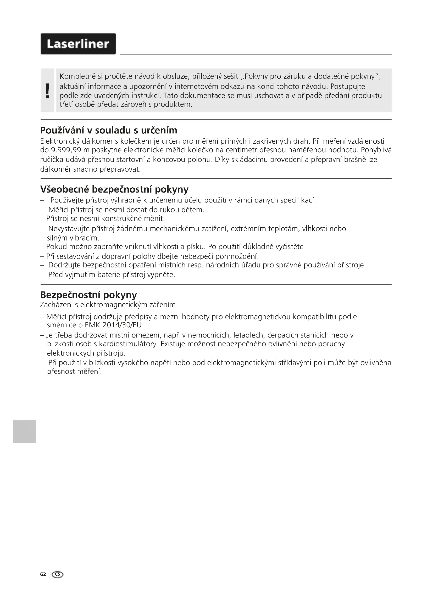 Technické parametry (Kechnické změny vyhrazeny. 23W13) Přesnost ± 0,1% Dosah 0 – 9.999,99 m Poloměr měřicího kolečka 159 mm Obvod měřicího kolečka 1000 mm Funkce Měření délky, Přičítání a odečítání délek Jednotky ft, m Paměť 5 míst v paměti Automatické vypnutí po 5 minutách (při nezměněném zobrazení displeje) Napájení 1 x 9V 6LR61 (Bloková baterie 9V) Pracovní teplota 0 … 40 °C Teplota skladování -20 °C … 70 °C Rozměry (Š x V x H) 318 x 1000 x 140 mm Hmotnost (včetně baterií) 2100 g Ustanovení EU a UK a likvidace Přístroj splňuje všechny potřebné normy pro volný pohyb zboží v rámci EU a UK. Tento výrobek, včetně příslušenství a obalu, je elektrický spotřebič, který podle evropských a britských směrnic o odpadních elektrických a elektronických zařízeních, bateriích a obalech musí být recyklován způsobem šetrným k životnímu prostředí, aby se znovu získaly cenné suroviny. Další bezpečnostní a dodatkové pokyny najdete na: https://www.laserliner.com Složení pro přepravu Pokyny pro údržbu a ošetřování Všechny komponenty čistěte lehce navlhčeným hadrem a nepoužívejte žádné čisticí nebo abrazivní prostředky ani rozpouštědla. Před delším skladováním vyjměte baterii/baterie. Skladujte přístroj na čistém, suchém místě. Kalibrace Pro zajištění přesnosti měřených výsledků se měřicí přístroj musí pravidelně kalibrovat a testovat. Kalibrace doporučujeme provádět v jednoročním intervalu. Spojte se sVaším specializovaným prodejcem nebo využijte servisního oddělení společnosti UMAREX-LASERLINER.66