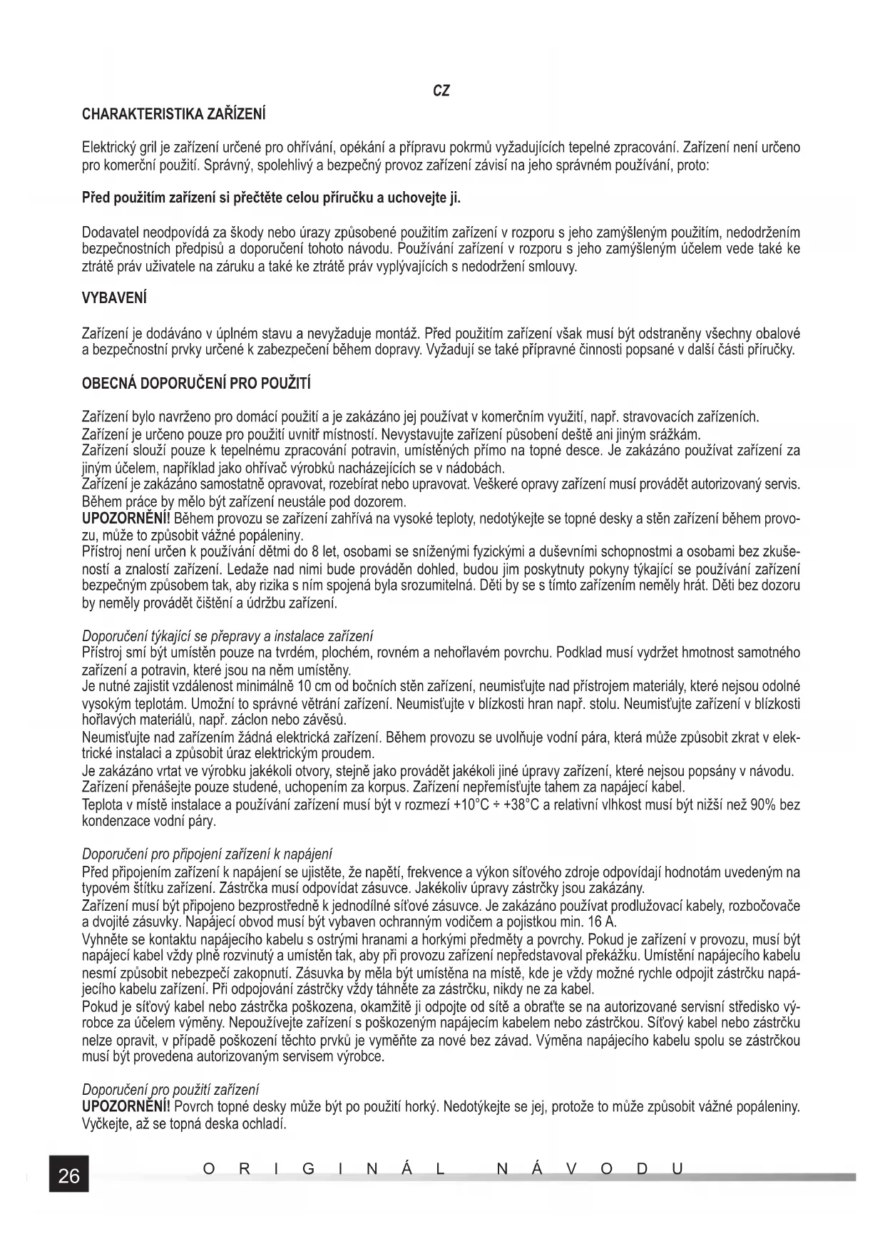Elektrický gril je zařízení určené pro ohřívání, opékání a přípravu pokrmů vyžadujících tepelné zpracování. Zařízení není určeno pro komerční použití. Správný, spolehlivý a bezpečný provoz zařízení závisí na jeho správném používání, proto: Před použitím zařízení si přečtěte celou příručku a uchovejte ji. Dodavatel neodpovídá za škody nebo úrazy způsobené použitím zařízení v rozporu s jeho zamýšleným použitím, nedodržením bezpečnostních předpisů a doporučení tohoto návodu. Používání zařízení v rozporu s jeho zamýšleným účelem vede také ke ztrátě práv uživatele na záruku a také ke ztrátě práv vyplývajících s nedodržení smlouvy. VYBAVENÍ Zařízení je dodáváno v úplném stavu a nevyžaduje montáž. Před použitím zařízení však musí být odstraněny všechny obalové a bezpečnostní prvky určené k zabezpečení během dopravy. Vyžadují se také přípravné činnosti popsané v další části příručky.