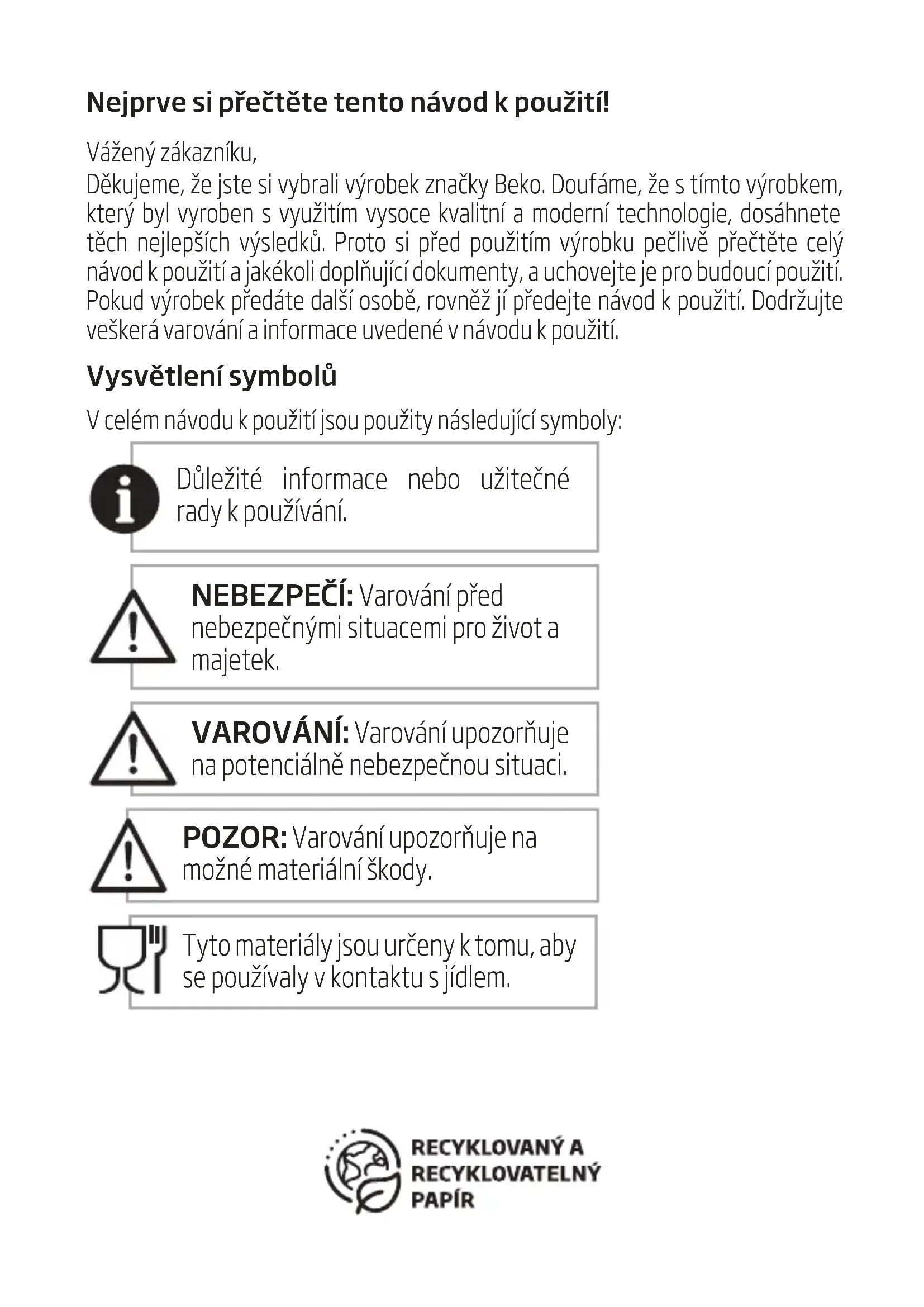 Nejprve si přečtěte tento návod k použití! Vážený zákazníku, Děkujeme, že jste si vybrali výrobek značky Beko. Doufáme, že s tímto výrobkem, který byl vyroben s využitím vysoce kvalitní a moderní technologie, dosáhnete těch nejlepších výsledků. Proto si před použitím výrobku pečlivě přečtěte celý návod k použití a jakékoli doplňující dokumenty, a uchovejte je pro budoucí použití. Pokud výrobek předáte další osobě, rovněž jí předejte návod k použití. Dodržujte veškerá varování a informace uvedené v návodu k použití. Vysvětlení symbolů V celém návodu k použití jsou použity následující symboly: Důležté nformace nebo užtečné rady k používání. NEBEZPEČÍ: Varování před nebezpečným stuacem pro žvot a majetek. VAROVÁNÍ: Varování upozorňuje na potencálně nebezpečnou stuac. POZOR: Varování upozorňuje na možné materální škody. Tyto materály jsou určeny k tomu, aby se používaly v kontaktu s jídlem.1. Vnější odkapávací miska