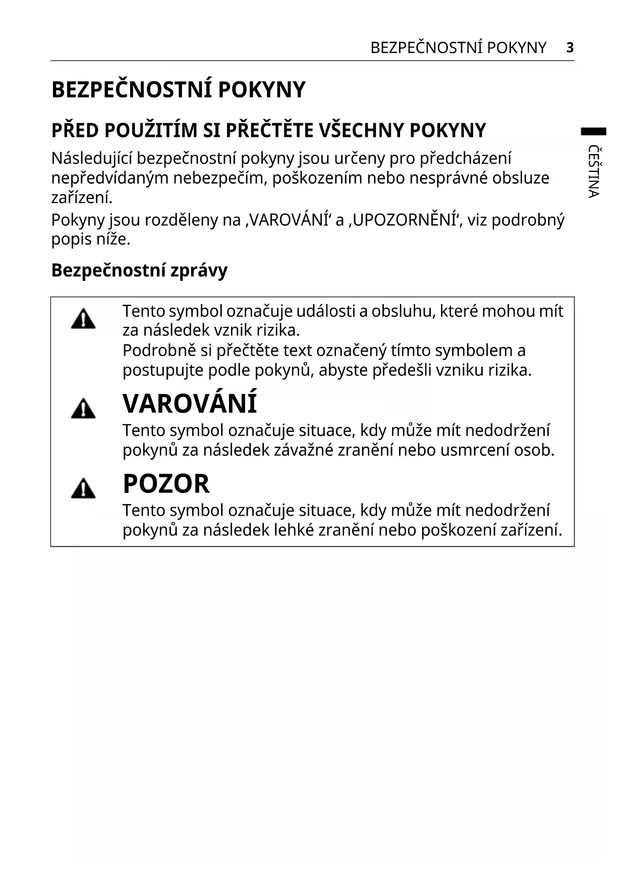 PŘED POUŽITÍM SI PŘEČTĚTE VŠECHNY POKYNY Následující bezpečnostní pokyny jsou určeny pro předcházení nepředvídaným nebezpečím, poškozením nebo nesprávné obsluze zařízení. Pokyny jsou rozděleny na ‚VAROVÁNÍ‘ a ‚UPOZORNĚNÍ‘, viz podrobný popis níže. Bezpečnostní zprávy Tento symbol označuje události a obsluhu, které mohou mít za následek vznik rizika. Podrobně si přečtěte text označený tímto symbolem a postupujte podle pokynů, abyste předešli vzniku rizika. VAROVÁNÍ Tento symbol označuje situace, kdy může mít nedodržení pokynů za následek závažné zranění nebo usmrcení osob. POZOR Tento symbol označuje situace, kdy může mít nedodržení pokynů za následek lehké zranění nebo poškození zařízení.4