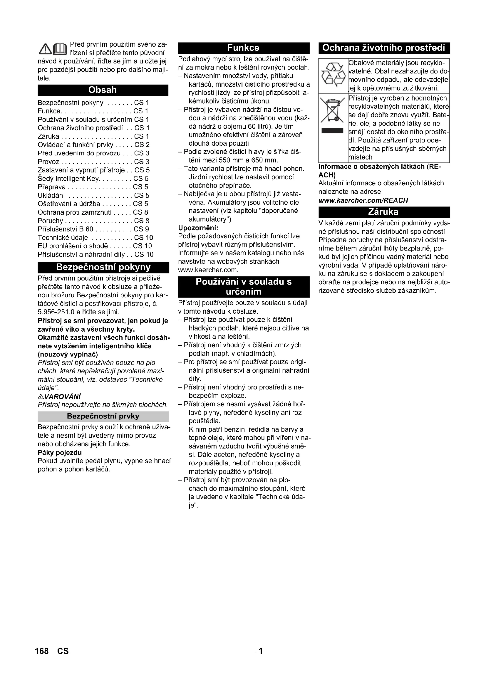 Tartozékok és alkatrészek Chairman of the Board of Management Director Regulatory Affairs & Certification 167HU- 1 Před prvním použitím svého za- řízení si přečtěte tento původní návod k používání, řiďte se jím a uložte jej pro pozdější použití nebo pro dalšího maji- tele. Před prvním použitím přístroje si pečlivě přečtěte tento návod k obsluze a přilože- nou brožuru Bezpečnostní pokyny pro kar- táčové čisticí a postřikovací přístroje, č. 5.956-251.0 a řiďte se jimi. Přístroj se smí provozovat, jen pokud je zavřené víko a všechny kryty. Okamžité zastavení všech funkcí dosáh- nete vytažením inteligentního klíče (nouzový vypínač) Přístroj smí být používán pouze na plo- chách, které nepřekračují povolené maxi- mální stoupání, viz. odstavec "Technické údaje". 몇 VAROVÁNÍ Přístroj nepoužívejte na šikmých plochách. Bezpečnostní prvky slouží k ochraně uživa- tele a nesmí být uvedeny mimo provoz nebo obcházena jejich funkce. Páky pojezdu Pokud uvolníte pedál plynu, vypne se hnací pohon a pohon kartáčů. Podlahový mycí stroj lze používat na čiště- ní za mokra nebo k leštění rovných podlah. – Nastavením množství vody, přítlaku kartáčů, množství čisticího prostředku a rychlosti jízdy lze přístroj přizpůsobit ja- kémukoliv čisticímu úkonu. – Přístroj je vybaven nádrží na čistou vo- dou a nádrží na znečištěnou vodu (kaž- dá nádrž o objemu 60 litrů). Je tím umožněno efektivní čištění a zároveň dlouhá doba použití. – Podle zvolené čisticí hlavy je šířka čiš- tění mezi 550 mm a 650 mm. – Tato varianta přístroje má hnací pohon. Jízdní rychlost lze nastavit pomocí otočného přepínače. – Nabíječka je u obou přístrojů již vesta- věna. Akumulátory jsou volitelné dle nastavení (viz kapitolu "doporučené akumulátory") Upozornění: Podle požadovaných čisticích funkcí lze přístroj vybavit různým příslušenstvím. Informujte se v našem katalogu nebo nás navštivte na webových stránkách www.kaercher.com. Přístroj používejte pouze v souladu s údaji v tomto návodu k obsluze. – Přístroj lze používat pouze k čištění hladkých podlah, které nejsou citlivé na vlhkost a na leštění. – Přístroj není vhodný k čištění zmrzlých podlah (např. v chladírnách). – Pro přístroj se smí používat pouze origi- nální příslušenství a originální náhradní díly. – Přístroj není vhodný pro prostředí s ne- bezpečím exploze. – Přístrojem se nesmí vysávat žádné hoř- lavé plyny, neředěné kyseliny ani roz- pouštědla. K nim patří benzín, ředidla na barvy a topné oleje, které mohou při víření v na- sávaném vzduchu tvořit výbušné smě- si. Dále aceton, neředěné kyseliny a rozpouštědla, neboť mohou poškodit materiály použité v přístroji. – Přístroj smí být provozován na plo- chách do maximálního stoupání, které je uvedeno v kapitole "Technické úda- je". Informace o obsažených látkách (RE- ACH) Aktuální informace o obsažených látkách naleznete na adrese: www.kaercher.com/REACH V každé zemi platí záruční podmínky vyda- né příslušnou naší distribuční společností. Případné poruchy na příslušenství odstra- níme během záruční lhůty bezplatně, po- kud byl jejich příčinou vadný materiál nebo výrobní vada. V případě uplatňování náro- ku na záruku se s dokladem o zakoupení obraťte na prodejce nebo na nejbližší auto- rizované středisko služeb zákazníkům. Obsah Bezpečnostní pokyny . . . . . . . CS 1 Funkce. . . . . . . . . . . . . . . . . . . CS 1 Používání v souladu s určením CS 1 Ochrana životního prostředí . . CS 1 Záruka . . . . . . . . . . . . . . . . . . . CS 1 Ovládací a funkční prvky . . . . . CS 2 Před uvedením do provozu . . . CS 3 Provoz . . . . . . . . . . . . . . . . . . . CS 3 Zastavení a vypnutí přístroje . . CS 5 Šedý Intelligent Key. . . . . . . . . CS 5 Přeprava . . . . . . . . . . . . . . . . . CS 5 Ukládání . . . . . . . . . . . . . . . . . CS 5 Ošetřování a údržba . . . . . . . . CS 5 Ochrana proti zamrznutí . . . . . CS 8 Poruchy . . . . . . . . . . . . . . . . . . CS 8 Příslušenství B 60 . . . . . . . . . . CS 9 Technické údaje . . . . . . . . . . . CS 10 EU prohlášení o shodě . . . . . . CS 10 Příslušenství a náhradní díly . . CS 10 Bezpečnostní pokyny Bezpečnostní prvky Funkce Používání v souladu s určením Ochrana životního prostředí Obalové materiály jsou recyklo- vatelné. Obal nezahazujte do do- movního odpadu, ale odevzdejte jej k opětovnému zužitkování. Přístroj je vyroben z hodnotných recyklovatelných materiálů, které se dají dobře znovu využít. Bate- rie, olej a podobné látky se ne- smějí dostat do okolního prostře- dí. Použitá zařízení proto ode- vzdejte na příslušných sběrných místech Záruka 168 CS- 2 1 Páka ke spouštění sací lišty 2 Víko nádrže na špinavou vodu 3 Přídržná lišta pro Homebase 4 Ochranné síto na turbíny (pod plovákem) 5 Vyplachovací systém nádrže na znečiš- těnou vodu (volitelné) 6 Flexibilní uzávěr vyplachovacího systé- mu (volitelné) 7 Zablokování nádrže na znečištěnou vodu 8 Plovák 9 Posuvné rameno 10 Sítko na hrubé nečistoty 11 Nádrž na špinavou vodu 12 Plnicí otvor nádrže na čistou vodu 13 Sací hadice na čisticí prostředek (pou- ze varianta DOSE) 14 Láhev s čisticím prostředkem (pouze varianta DOSE) 15 Uzávěr nádrže na čerstvou vodu s fil- trem 16 Držák láhve na čisticí prostředek 17 Nádrž na čistou vodu 18 Pojistka nádrže 19 Čisticí hlava (názorný obrázek) * 20 Kartáčové válce (varianta BR), kotou- čové kartáče (varianta BD) * 21 Nádrž na hrubé nečistoty (jen model BR) 22 Zabezpeč