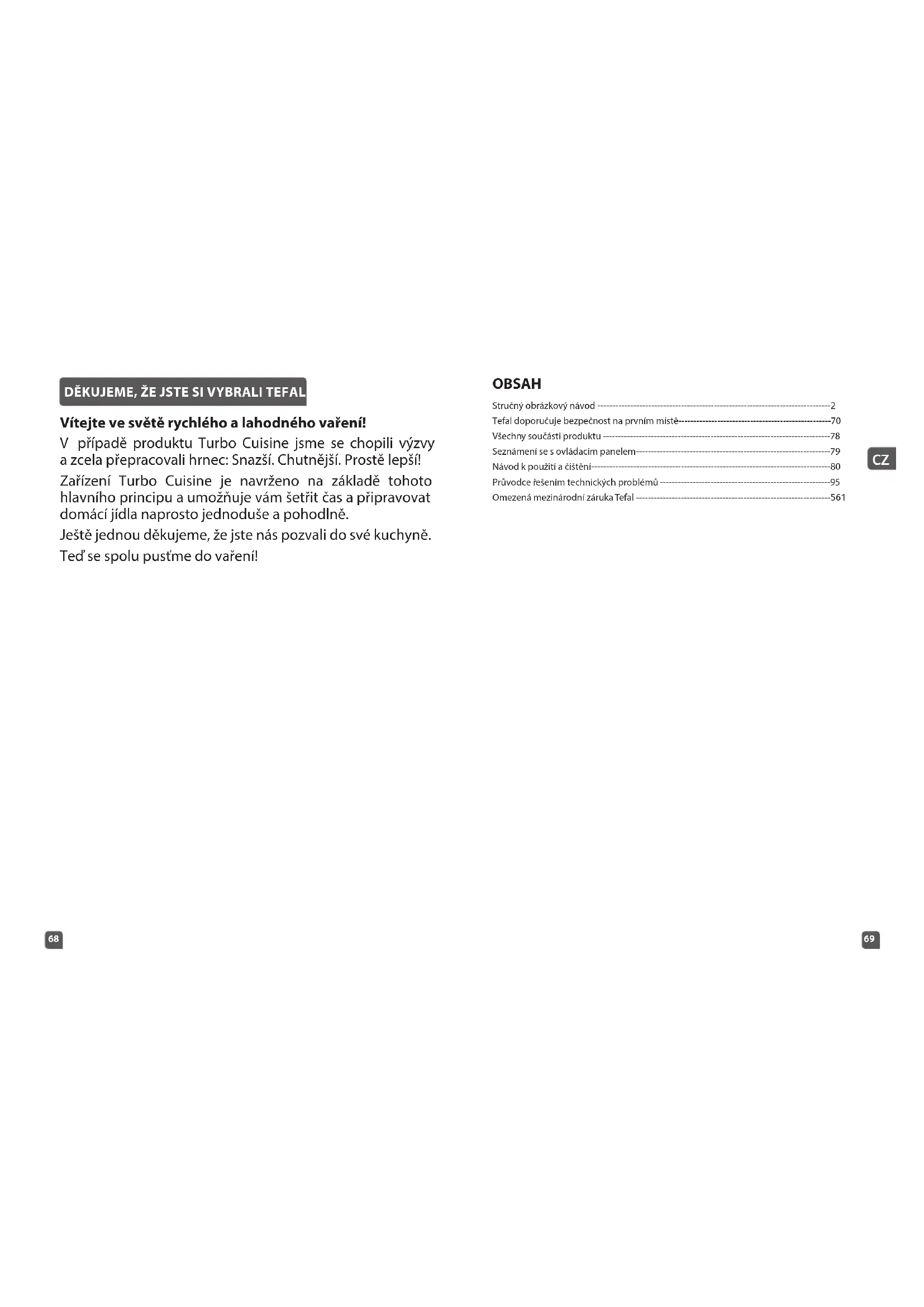 DĚKUJEME, ŽE JSTE SI VYBRALI TEFAL Vítejte ve světě rychlého alahodného vaření! V případě produktu Turbo Cuisine jsme se chopili výzvy azcela přepracovali hrnec: Snazší. Chutnější. Prostě lepší! Zařízení Turbo Cuisine je navrženo na základě tohoto hlavního principu aumožňuje vám šetřit čas apřipravovat domácí jídla naprosto jednoduše apohodlně. Ještě jednou děkujeme, že jste nás pozvali do své kuchyně. Teď se spolu pusťme do vaření! OBSAH Stručný obrázkový návod ------------------------------------------------------------------------------2 Tefal doporučuje bezpečnost na prvním místě---------------------------------------------------70 Všechny součásti produktu ----------------------------------------------------------------------------78 Seznámení se sovládacím panelem -----------------------------------------------------------------79 Návod kpoužití ačištění --------------------------------------------------------------------------------80 Průvodce řešením technických problémů ---------------------------------------------------------95 Omezená mezinárodní záruka Tefal -----------------------------------------------------------------5617170