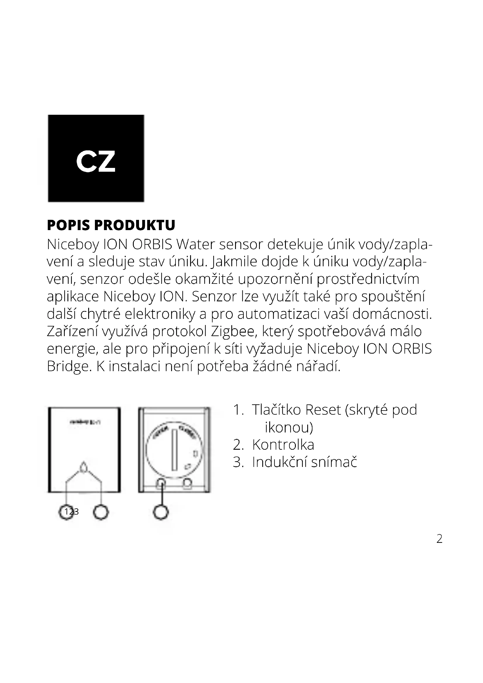 POPIS PRODUKTU Niceboy ION ORBIS Water sensor detekuje únik vody/zapla- vení asleduje stav úniku. Jakmile dojde kúniku vody/zapla- vení, senzor odešle okamžité upozornění prostřednictvím aplikace Niceboy ION. Senzor lze využít také pro spouštění další chytré elektroniky apro automatizaci vaší domácnosti. Zařízení využívá protokol Zigbee, který spotřebovává málo energie, ale pro připojení ksíti vyžaduje Niceboy ION ORBIS Bridge. Kinstalaci není potřeba žádné nářadí.