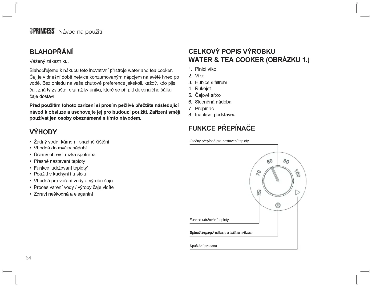 - För detaljerade garantivillkor, se vår servicewebbplats: service.princess.info SV84 BLAHOPŘÁNÍ Vážený zákazníku, Blahopřejeme k nákupu této inovativní přístroje water and tea cooker. Čaj je v dnešní době nejvíce konzumovaným nápojem na světě hned po vodě. Bez ohledu na vaše chuťové preference jakékoli, každý, kdo pije čaj, zná ty zvláštní okamžiky úniku, které se při pití dokonalého šálku čaje dostaví. Před použitím tohoto zařízení si prosím pečlivě přečtěte následující návod k obsluze a uschovejte jej pro budoucí použití. Zařízení smějí používat jen osoby obeznámené s tímto návodem. VÝHODY