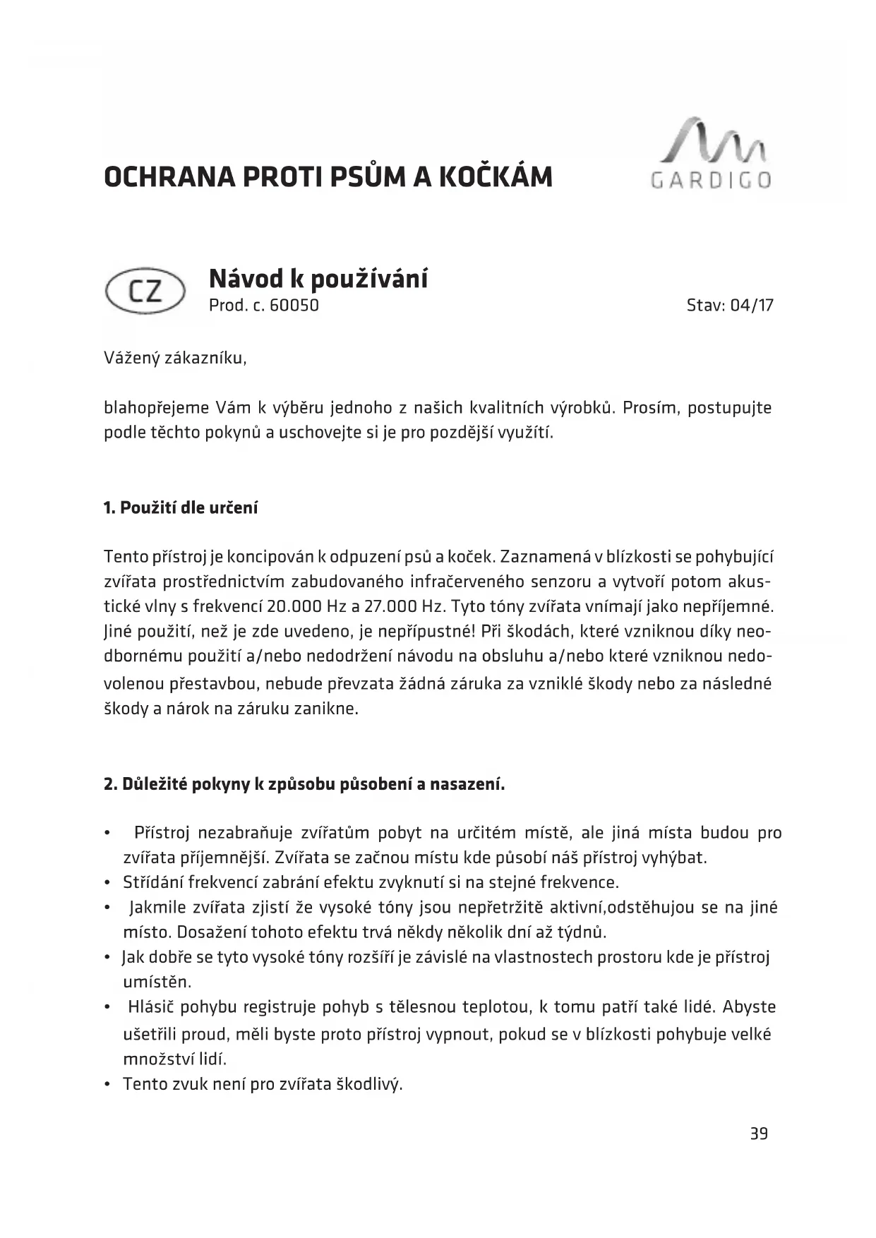 NÁVOD K OBSLUZE 60050 Gardigo