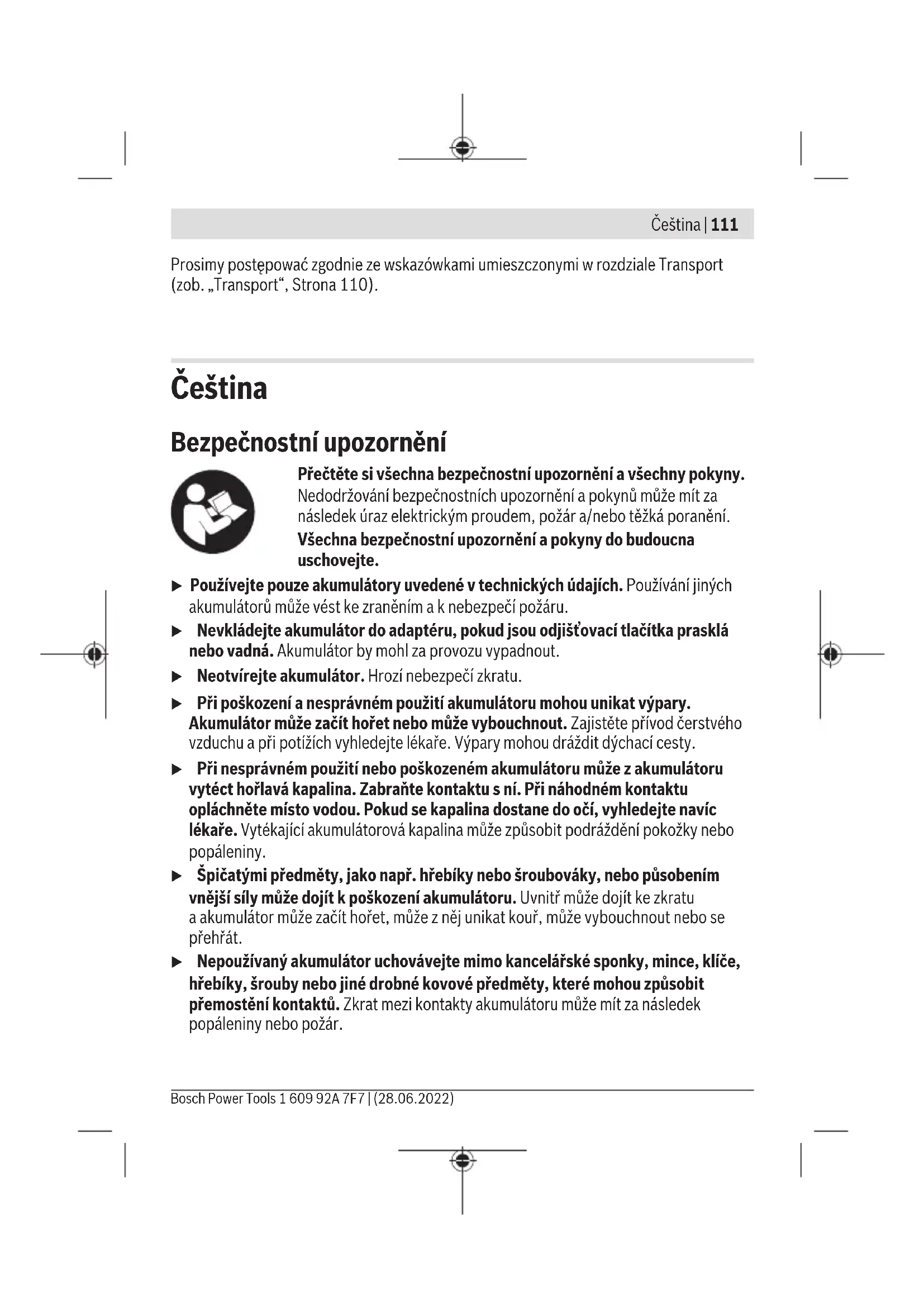 Topný prvek se nezahřeje. Nabijte akumulátor. Kabel topného prvku zapojte do zdířky(2) vadaptéru akumulátoru(1). Aktivujte adaptér akumulátoru(1) tlačítkem(5). Oděv se nevyhřívá aexterní USB zařízení nelze nabíjet. Vyjměte akumulátor zadaptéru. Počkejte 10sekund Akumulátor opět nasaďte do adaptéru. A) Některé USB přístroje nelze tímto adaptérem akumulátoru nabíjet, ačkoli technické údaje souhlasí. Údržba aservis Zákaznická služba aporadenství ohledně použití Zákaznická služba zodpoví vaše dotazy kopravě aúdržbě vašeho výrobku atéž knáhradním dílům. Rozkladové výkresy ainformace onáhradních dílech najdete také na: www.bosch-pt.com Vpřípadě dotazů knašim výrobkům apříslušenství vám ochotně pomůže poradenský tým Bosch. Vpřípadě veškerých otázek aobjednávek náhradních dílů bezpodmínečně uveďte 10místné věcné číslo podle typového štítku výrobku. Czech Republic Robert Bosch odbytová s.r.o. Bosch Service Center PT K Vápence 1621/16 692 01 Mikulov Na www.bosch-pt.cz si si můžete objednat opravu Vašeho stroje nebo náhradní díly online. Tel.: +420 519 305700 Fax: +420 519 305705 1 609 92A 7F7 | (28.06.2022) Bosch Power ToolsČeština | 117 E-Mail: servis.naradi@cz.bosch.com www.bosch-pt.cz Další adresy servisů najdete na: www.bosch-pt.com/serviceaddresses Přeprava Pro lithium-iontové akumulátory platí požadavky zákonných předpisů onebezpečných nákladech. Tyto akumulátory mohou být bez dalších podmínek přepravovány uživatelem po silnici. Při zasílání prostřednictvím třetí osoby (např.: letecká přeprava nebo spedice) je třeba brát zřetel na zvláštní požadavky na balení aoznačení. Zde musí být při přípravě zásilky nezbytně přizván expert na nebezpečné náklady. Akumulátory zasílejte pouze tehdy, pokud není poškozený kryt. Otevřené kontakty přelepte lepicí páskou aakumulátor zabalte tak, aby se vobalu nemohl pohybovat. Dodržujte také případné další národní předpisy. Likvidace Elektrické nářadí, akumulátory/baterie, příslušenství aobaly je třeba odevzdat kekologické recyklaci. Elektrické nářadí aakumulátory/baterie nevyhazujte do domovního odpadu! Pouze pro zeměEU: Podle evropské směrnice 2012/19/EU oodpadních elektrických aelektronických zařízeních ajejího provedení ve vnitrostátním právu se musí již nepoužitelná elektrická zařízení apodle evropské směrnice 2006/66/ES vadné nebo opotřebované akumulátory/baterie shromažďovat odděleně aodevzdat kekologické recyklaci. Při nesprávné likvidaci mohou odpadní elektrická aelektronická zařízení kvůli případnému obsahu nebezpečných látek poškodit životní prostředí alidské zdraví. Akumulátory/baterie: Lithium-iontové: Dodržujte pokyny uvedené včásti Přeprava (viz „Přeprava“, Stránka117). Bosch Power Tools 1 609 92A 7F7 | (28.06.2022)118 | Slovenčina Slovenčina Bezpečnostné upozornenia Prečítajte si všetky bezpečnostné upozornenia apokyny. Zaned- banie pri dodržiavaní bezpečnostných upozornení apokynov môže zapríčiniť zásah elektrickým prúdom, požiar a/alebo ťažké zranenia. Všetky bezpečnostné upozornenia apokyny si uschovajte do bu- dúcnosti. u Používajte len akumulátory uvedené vtechnických údajoch. Používanie iných aku- mulátorov môže mať za následok poranenie anebezpečenstvo požiaru. u Nevsúvajte akumulátor do adaptéra, keď sú uvoľňovacie tlačidlá zlomené alebo poškodené. Akumulátor môže počas prevádzky vypadnúť. u Akumulátor neotvárajte. Hrozí nebezpečenstvo skratu. u Po poškodení akumulátora alebo vprípade neodborného používania môžu zaku- mulátora vystupovať škodlivé výpary. Akumulátor môže horieť alebo vybuchnúť. Zabezpečte prívod čerstvého vzduchu avprípade ťažkostí vyhľadajte lekára. Tieto vý- pary môžu podráždiť dýchacie cesty. u Pri nesprávnom používaní alebo poškodení akumulátora môže zneho vytekať kvapalina. Vyhýbajte sa kontaktu stouto kvapalinou. Po náhodnom kontakte miesto opláchnite vodou. Ak sa dostane kvapalina zakumulátora do kontaktu sočami, po výplachu očí vyhľadajte lekára. Unikajúca kvapalina zakumulátora mô- že mať za následok podráždenie pokožky alebo popáleniny. u Špicatými predmetmi, ako napr.klince alebo skrutkovače alebo pôsobením von- kajšej sily môže dôjsť kpoškodeniu akumulátora. Vo vnútri môže dôjsť kuskratu aakumulátor môže začať horieť, môže zneho unikať dym, môže vybuchnúť alebo sa prehriať. u Nepoužívaný akumulátor neskladujte tak, aby mohol prísť do styku skancelár- skymi sponkami, mincami, kľúčmi, klincami, skrutkami alebo sinými drobnými kovovými predmetmi, ktoré by mohli spôsobiť premostenie kontaktov. Skrat medzi kontaktmi akumulátora môže mať za následok popálenie alebo vznik požiaru. Chráňte akumulátor pred teplom, napr. aj pred trvalým slnečným žiarením, pred ohňom, špinou, vodou avlhkosťou. Hrozí nebezpe- čenstvo výbuchu askratu. 1 609 92A 7F7 | (28.06.2022) Bosch Power ToolsSlovenčina | 119 Opis výrobku avýkonu Prečítajte si všetky bezpečnostné upozornenia apokyny. Nedodr- žiavanie bezpečnostných upozornení apokynov môže zapríčiniť úraz elektrickým prúdom, požiar a/alebo ťažké poranenia. Prosím, všimnite si obrázky vprednej časti návodu na používanie. Používanie vsúlade surčením Akumulátorový adaptér slúži na vloženie lítiovo-iónového akumulátora Bosch snapätím 18V ako zdroja napätia. Sakumulátorovým adaptérom môžete súčasne napájať napätím maximálne dve USB zariadenia ajeden vyhrievací článok pre vyhrievanú bundu. Vyobrazené komponenty Číslovanie jednotlivých komponentov sa vzťahuje na vyobrazenie elektrického náradia na grafickej strane. (1) Akumulátorový adap