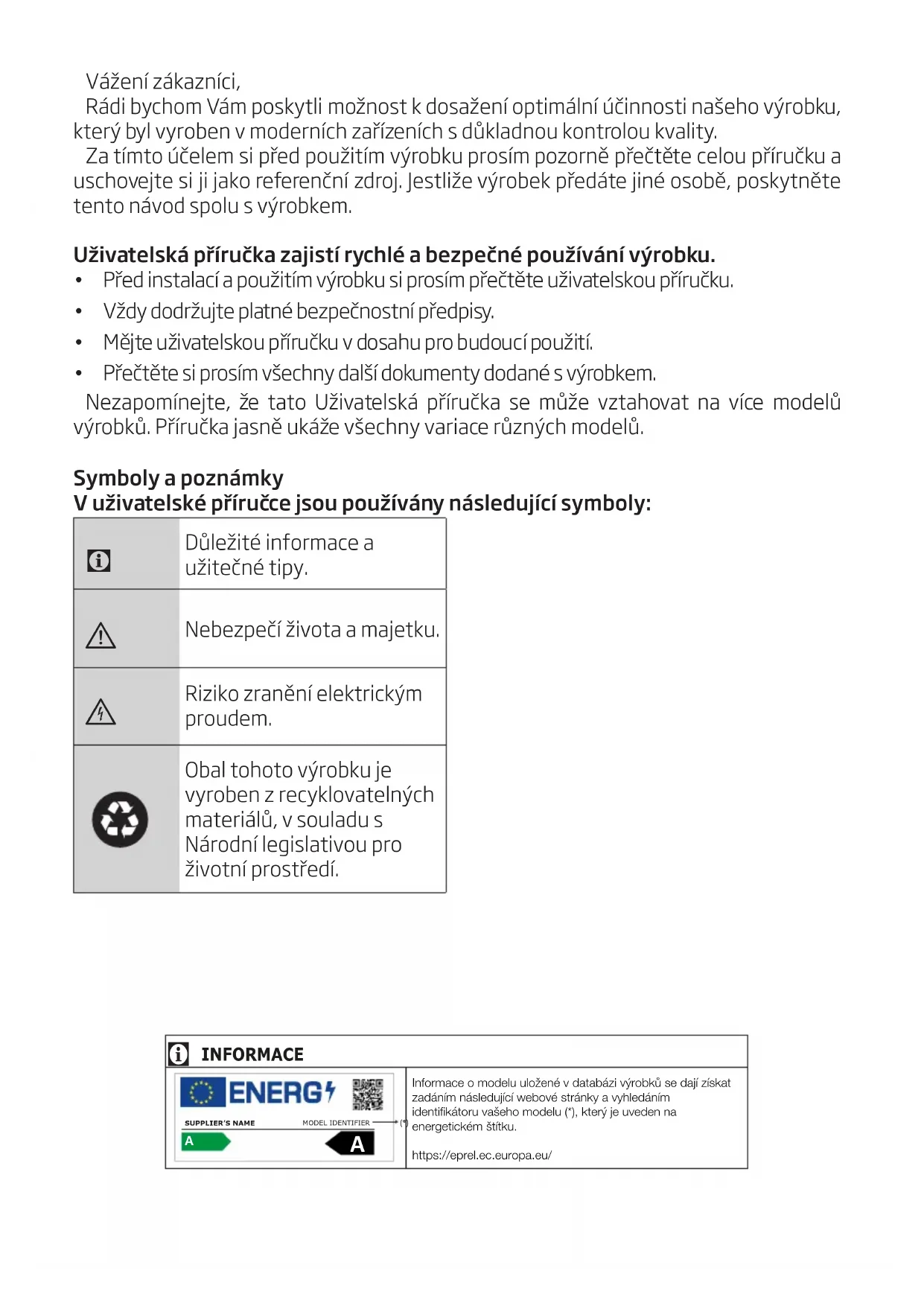Informace o modelu uložené v databázi výrobků se dají získat zadáním následující webové stránky a vyhledáním identifikátoru vašeho modelu (*), který je uveden na energetickém štítku.https://eprel.ec.europa.eu/