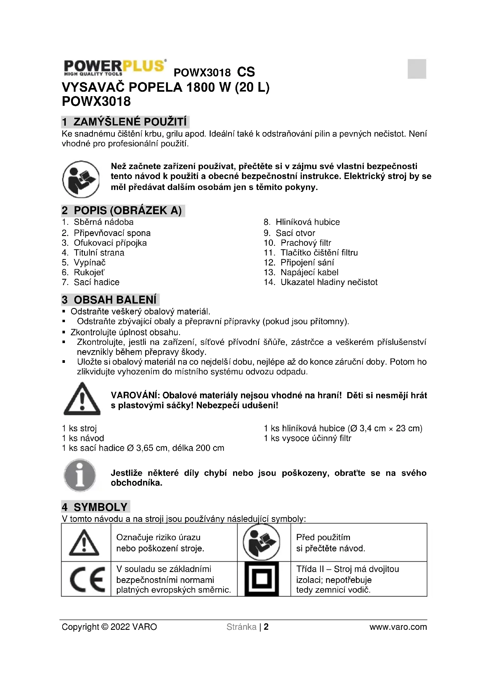 Motor se nespustí – Napájecí kabel není řádně zapojen do zásuvky. - Poškozený výstupní otvor. – Vysavač není zapnutý. - Řádně jednotku zapojte. - Zkontrolujte výstupní otvor. - Zapněte spotřebič. Slabší sací výkon - Jednotka je zanesena. - Je nutné vyčistit prachový filtr. - Sběrná nádoba není nasazena. - Zanesený filtr. - Odstraňte překážku. – Vyčistěte prachový filtr. - Sběrnou nádobu znovu připojte k vysavači. - Vyčistěte filtr. 11 TECHNICKÉ ÚDAJE Model č. POWX3018 Jmenovité napětí 220–240 V Jmenovitý kmitočet 50 Hz Jmenovitý výkon 1800 W Stupeň krytí Třída II Max teplota popela 40 °C Objem nádrže 20 l Délka kabelu 5 m Sací výkon 18 kPa Průměr trysky 34 mm Průměr hadice 36,5 mm Typ filtru Vysoce účinný filtr Materiál trysky Hliník Typ elektromotoru S kartáčky Průměr zásobníku 295 mm Výška zásobníku 285 mm Délka hadice 2 mPOWX3018 CS Copyright © 2022 VARO Stránka | 7 www.varo.com 12 ZÁRUKA