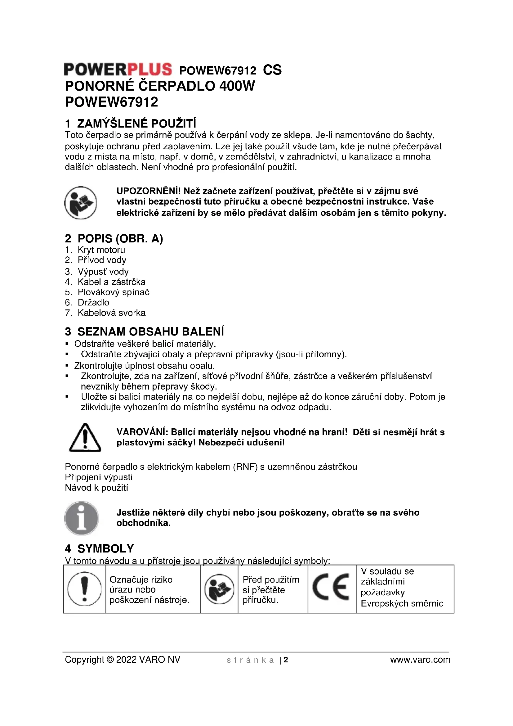 Použité zařízení nelikvidujte spolu s běžným domovním odpadem, ale řiďte se předpisy vydanými s ohledem na ochranu životního prostředí. Použitý motorový olej likvidujte způsobem slučitelným s péčí o životní prostředí. V kanystru jej předejte k recyklaci do vyhrazeného střediska pro likvidaci tohoto druhu odpadu. Nevyhazujte jej do odpadu ani jej nevylévejte na zem.POWEW67912 CS Copyright © 2022 VARO NV s t r á n k a | 8 www.varo.com