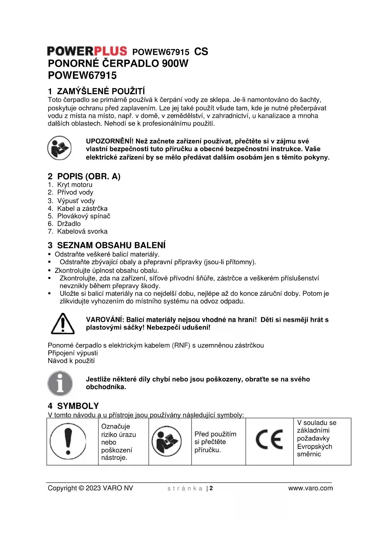 Použité zařízení nelikvidujte spolu s běžným domovním odpadem, ale řiďte se předpisy vydanými s ohledem na ochranu životního prostředí. Použitý motorový olej likvidujte způsobem slučitelným s péčí o životní prostředí. V kanystru jej předejte k recyklaci do vyhrazeného střediska pro likvidaci tohoto druhu odpadu. Nevyhazujte jej do odpadu ani jej nevylévejte na zem.POWEW67915 CS Copyright © 2023 VARO NV s t r á n k a | 8 www.varo.com