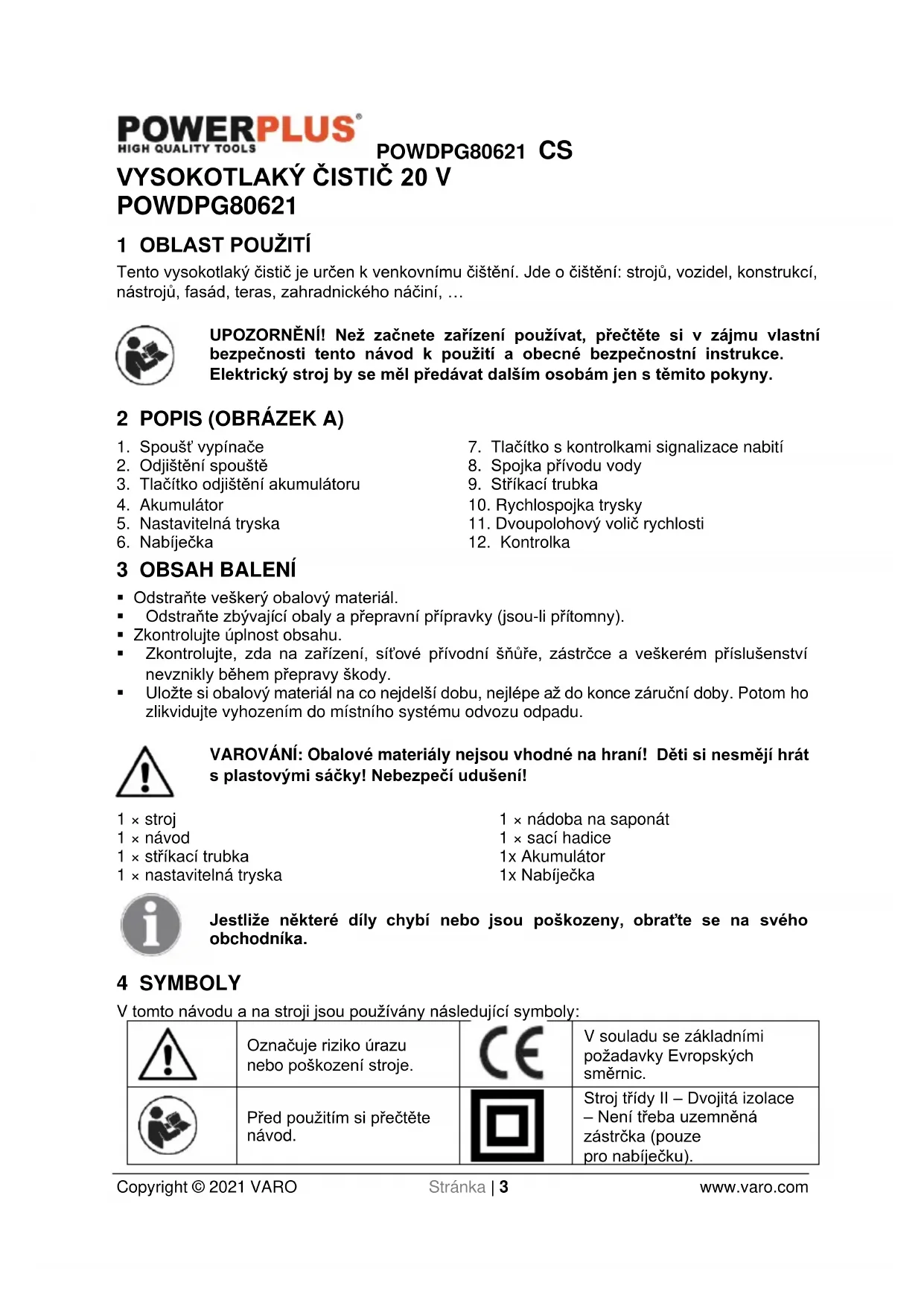 Stroj třídy II – Dvojitá izolace – Není třeba uzemněná zástrčka (pouze pro nabíječku).POWDPG80621 CS Copyright © 2021 VARO Stránka | 4 www.varo.com