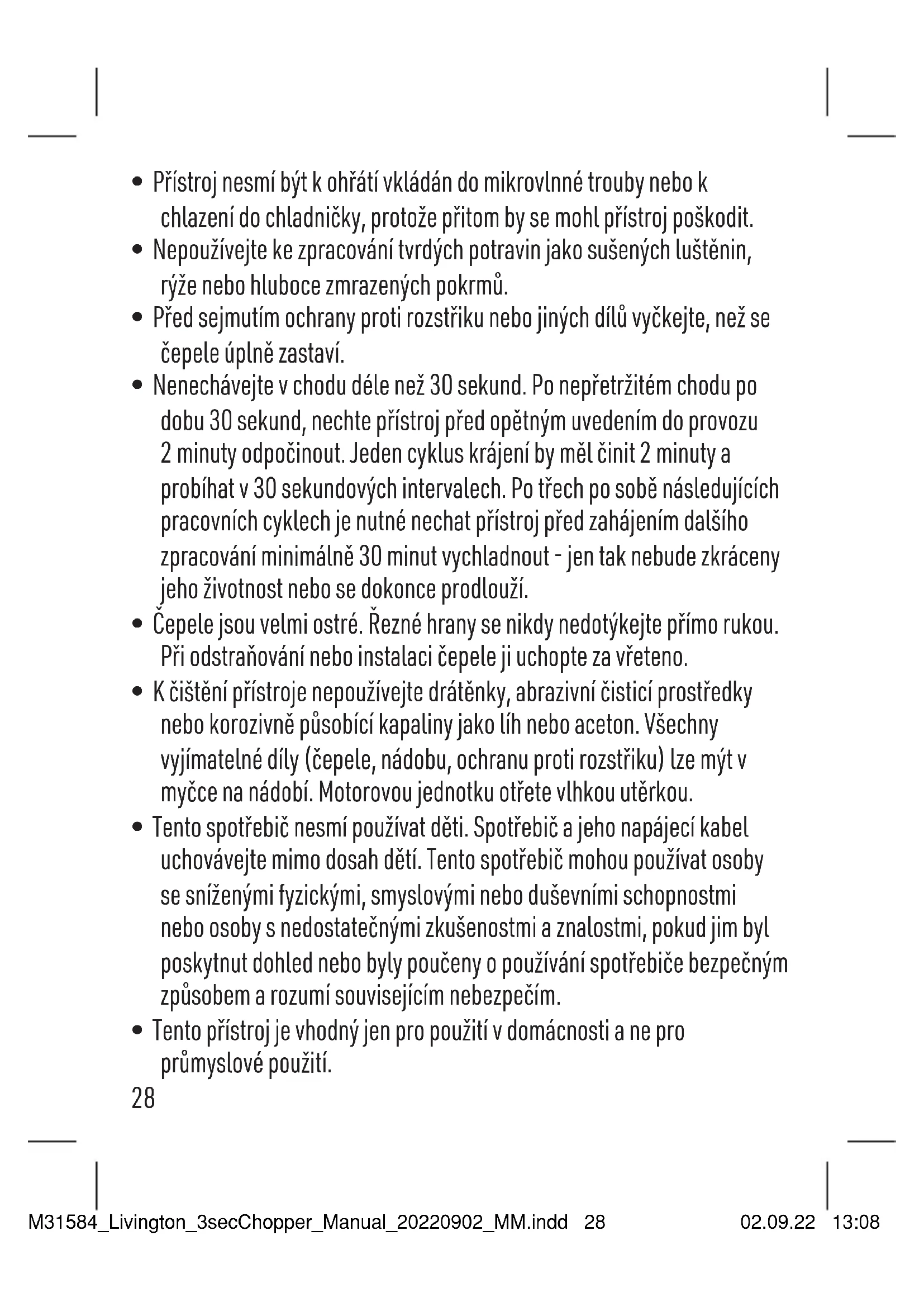 - Tento přístroj je vhodný jen pro použití v domácnosti a ne pro průmyslové použití. M31584_Livington_3secChopper_Manual_20220902_MM.indd 28M31584_Livington_3secChopper_Manual_20220902_MM.indd 28 02.09.22 13:0802.09.22 13:0829