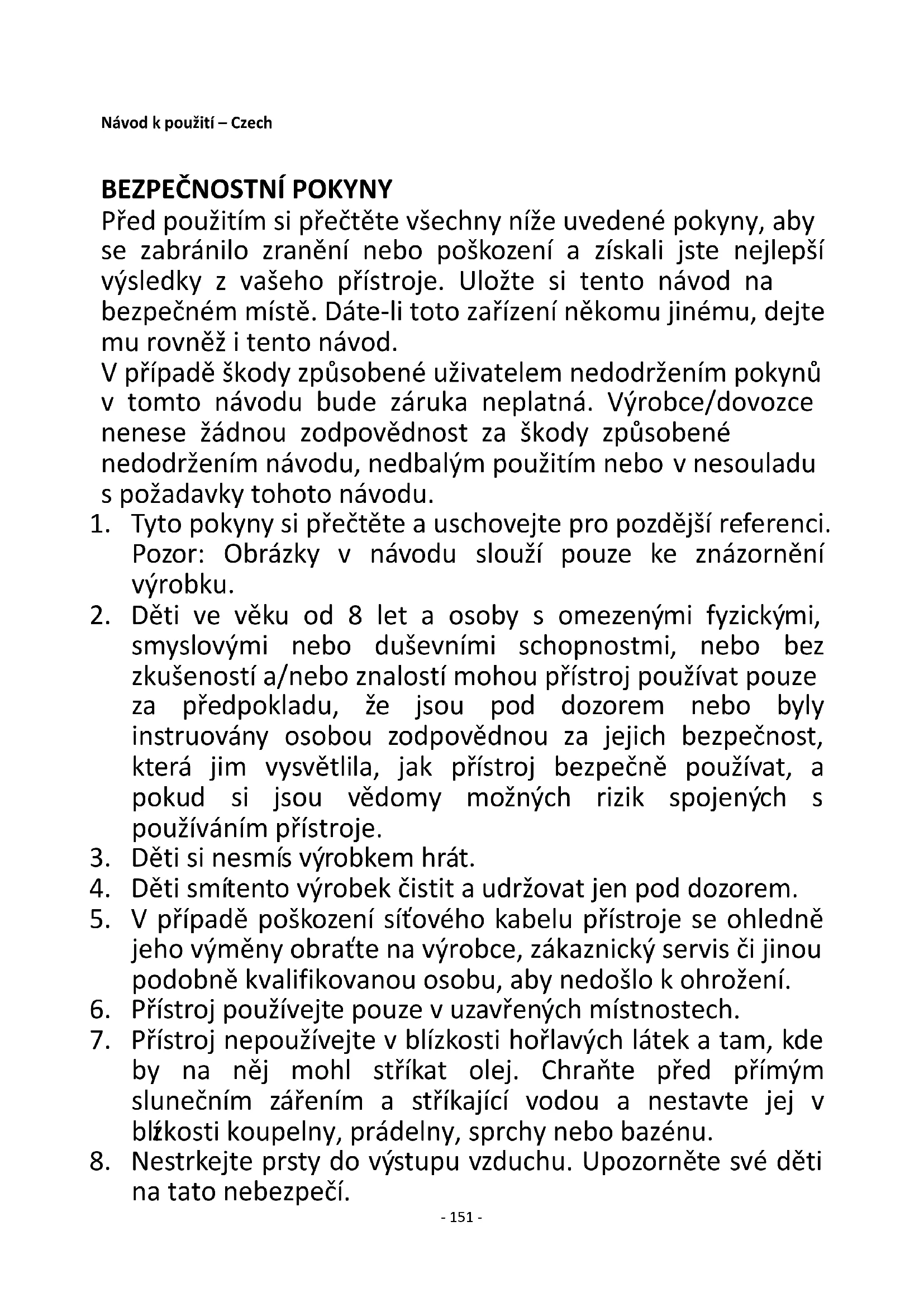 Před použitím si přečtěte všechny níže uvedené pokyny, aby se zabránilo zranění nebo poškození a získali jste nejlepší výsledky z vašeho přístroje. Uložte si tento návod na bezpečném místě. Dáte-li toto zařízení někomu jinému, dejte mu rovněž i tento návod. V případě škody způsobené uživatelem nedodržením pokynů v tomto návodu bude záruka neplatná. Výrobce/dovozce nenese žádnou zodpovědnost za škody způsobené nedodržením návodu, nedbalým použitím nebo v nesouladu s požadavky tohoto návodu.