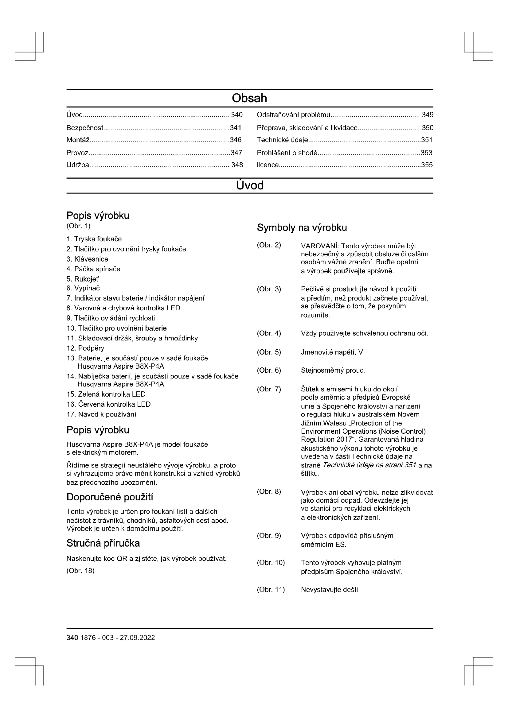 Popis výrobku Husqvarna Aspire B8X-P4A je model foukače selektrickým motorem. Řídíme se strategií neustálého vývoje výrobku, aproto si vyhrazujeme právo měnit konstrukci avzhled výrobků bez předchozího upozornění. Doporučené použití Tento výrobek je určen pro foukání listí adalších nečistot ztrávníků, chodníků, asfaltových cest apod. Výrobek je určen kdomácímu použití. Stručná příručka Naskenujte kód QR azjistěte, jak výrobek používat. (Obr. 18) Symboly na výrobku (Obr. 2) VAROVÁNÍ: Tento výrobek může být nebezpečný azpůsobit obsluze či dalším osobám vážné zranění. Buďte opatrní avýrobek používejte správně. (Obr. 3) Pečlivě si prostudujte návod kpoužití apředtím, než produkt začnete používat, se přesvědčte otom, že pokynům rozumíte. (Obr. 4) Vždy používejte schválenou ochranu očí. (Obr. 5) Jmenovité napětí, V (Obr. 6) Stejnosměrný proud. (Obr. 7) Štítek semisemi hluku do okolí podle směrnic apředpisů Evropské unie aSpojeného království anařízení oregulaci hluku vaustralském Novém Jižním Walesu „Protection of the Environment Operations (Noise Control) Regulation 2017“. Garantovaná hladina akustického výkonu tohoto výrobku je uvedena včásti Technické údaje na straně Technické údaje na strani 351 ana štítku. (Obr. 8) Výrobek ani obal výrobku nelze zlikvidovat jako domácí odpad. Odevzdejte jej ve stanici pro recyklaci elektrických aelektronických zařízení. (Obr. 9) Výrobek odpovídá příslušným směrnicímES. (Obr. 10) Tento výrobek vyhovuje platným předpisům Spojeného království. (Obr. 11) Nevystavujte dešti. 340 1876 - 003 - 27.09.2022(Obr. 15) Obsluha foukače musí zajistit, aby se vokruhu 15 metrů nepohybovali lidé ani zvířata. Pokud pracuje něko- lik pracovníků na stejné ploše, musí být dodržována bezpečná vzdálenost rozestupů minimálně 15metrů. Fou- kač může velkou silou odmrštit před- měty, které se mohou odrazit zpět. Po- kud nepoužíváte doporučené ochran- né prostředky, může dojít kvážnému poranění očí. yyyy wwxxxxx Typový štítek svýrobním číslem. yyyy znamená rok výroby, ww znamená tý- den výroby. Povšimněte si: Další symboly/štítky na výrobku se týkají zvláštních certifikačních požadavků pro určité obchodní trhy. Symboly na baterii nebo na nabíječce baterií (Obr. 16) Odevzdejte výrobek ve stanici pro recykla- ci elektrických aelek- tronických zařízení. (Platí pouze pro Evro- pu) (Obr. 17) Baterii používejte po- uze ve výrobcích od partnerů systému POWER FOR ALL. (Obr. 12) Transformátor se zabezpečením proti selhání. (Obr. 13) Nabíječku baterií používejte askladujte pouze ve vnitřních prostorech. (Obr. 14) Dvojitá izolace. Odpovědnost za výrobek Jak uvádí zákon o odpovědnosti za výrobek, neneseme odpovědnost za žádnou škodu způsobenou našim výrobkem, pokud: