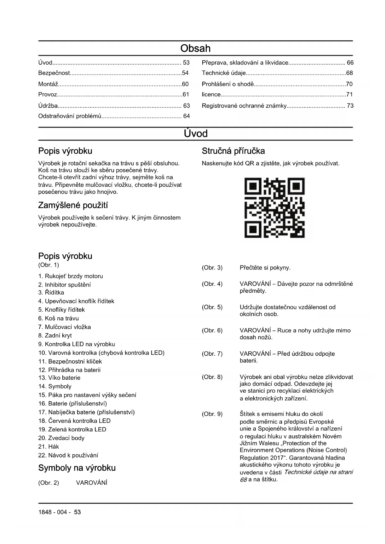 ana štítku. 1848 - 004 - 53(Obr. 10) Tento nástavec vyhovuje platným směrnicím ES. (Obr. 11) Tento výrobek vyhovuje platným předpisům Spojeného království. (Obr. 12) Výrobek je chráněn proti kapající vodě. (Obr. 13) Uvolněním rukojeti brzdy motoru zastavíte. (Obr. 14) Stlačením rukojeti brzdy motoru nastartujete pohon nožů. (Obr. 15) Skenovatelný kód. (Obr. 18) Otočením zamknete nebo odemknete. Povšimněte si: Další symboly/štítky na výrobku se týkají certifikačních požadavků pro určité obchodní trhy. Symboly na baterii nebo na nabíječce baterií (Obr. 19) Odevzdejte výrobek ve stanici pro recykla- ci elektrických aelek- tronických zařízení. (Platí pouze pro Evro- pu) (Obr. 20) Baterii používejte po- uze ve výrobcích od partnerů systému POWER FOR ALL. (Obr. 21) Chraňte baterii před teplem, např. před nepřetržitým intenzivním sluneč- ním světlem, ohněm, nečistotami, vodou avlhkostí. Hrozí nebezpečí výbuchu azkratu. (Obr. 22) (Obr. 16) Nabíječku baterií používejte askladujte pouze ve vnitřních prostorech. (Obr. 17) Dvojitá izolace. Štítek na výrobku (Obr. 23) NEBEZPEČÍ– Udržujte ruce anohy zdosahu. Odpovědnost za výrobek Jak uvádí zákon o odpovědnosti za výrobek, neneseme odpovědnost za žádnou škodu způsobenou našim výrobkem, pokud: