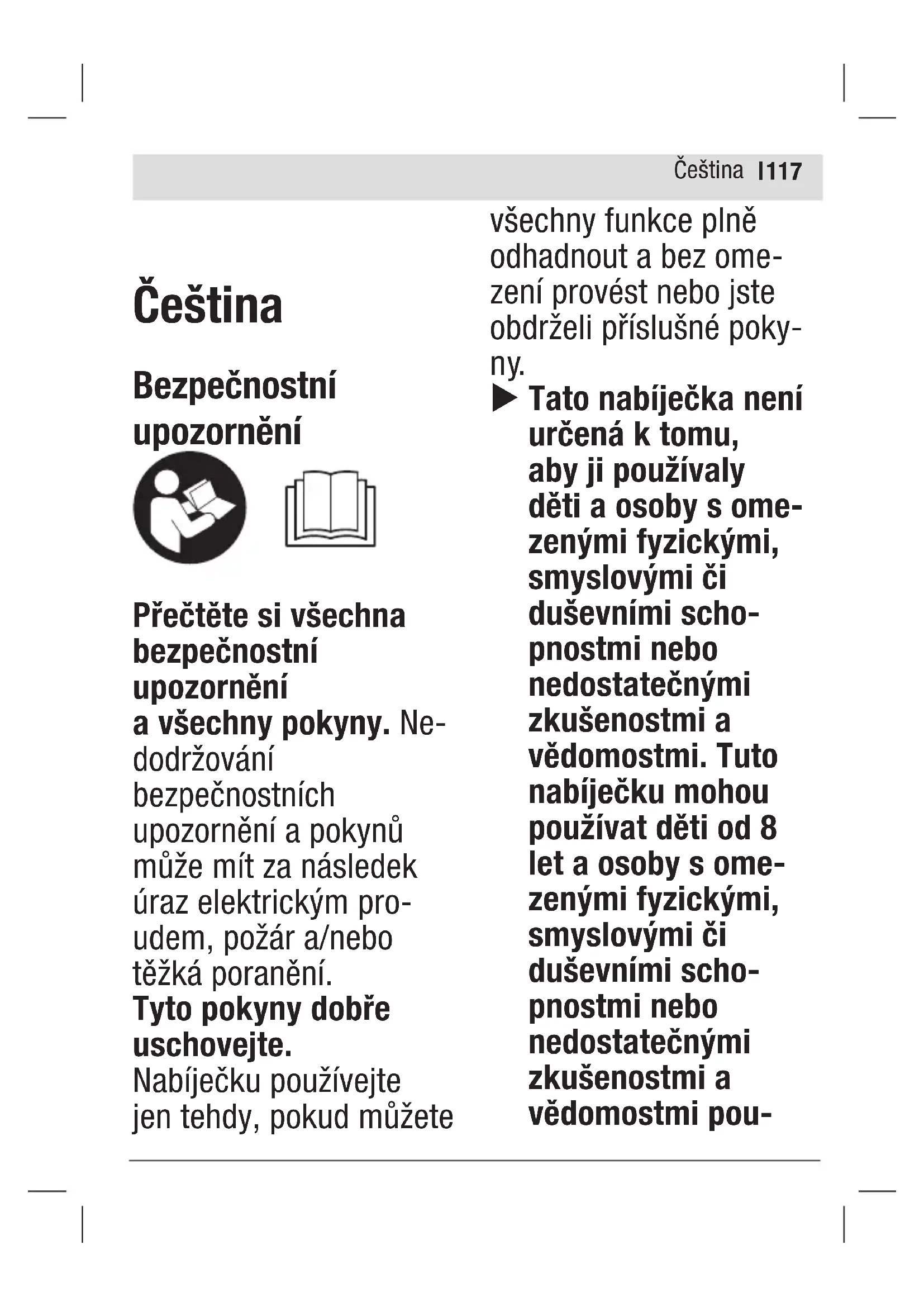 1,5 Ah ≈24 ≈33 2,0 Ah ≈32 ≈45 2,5 Ah ≈40 ≈60 3,0 Ah ≈48 ≈72 4,0 Ah ≈64 ≈95 4,0 Ah Power Plus ≈69 ≈88 5,0 Ah ≈80 ≈105 6,0 Ah ≈96 ≈130 Odpovídá stavu nabití ≈ 80 % odpovídá stavu plného nabití Čeština122 | Význam zobrazo- vaných prvků (Rychlé) blikání zelené kontrolky stavu nabití Proces rychlonabíje- ní je signalizován blikáním zeleného ukazatele nabíjení akumulátoru (2). Akumulátor lze kdykoli vyjmout a používat. Po dosažení cca 80 % kapacity akumulátoru se zpomalí blikání zeleného ukazatele stavu nabíje- ní. Proces rychlonabíjení je nyní dokončený. Pokud akumulátor zůstane v nabíječce, dokončí se proces nabíjení nižší rychlostí. (Pomalé) blikání zelené kontrolky stavu nabití Při nabití akumulá- toru na cca 80 % bliká zelená kontrolka stavu nabití (2) pomalu. Akumulátor lze vyjmout a ihned začít používat. Nepřetržitě svítící zelený ukazatel stavu nabití aku- mulátoru Nepřetržitě svítící zelená kontrolka stavu nabití (2) signalizuje, že je akumulá- tor plně nabitý. Akumulátor lze následně vyjmout pro okamžité použití. Bez nasazeného akumulátoru nepřetržitě svítící ukazatel stavu nabití (2) signalizuje, že je síťová zástrčka zapojena do zásuvky a nabíječka je připravena k provozu. Nepřetržitě svítící červená kontrolka sledování teplo-