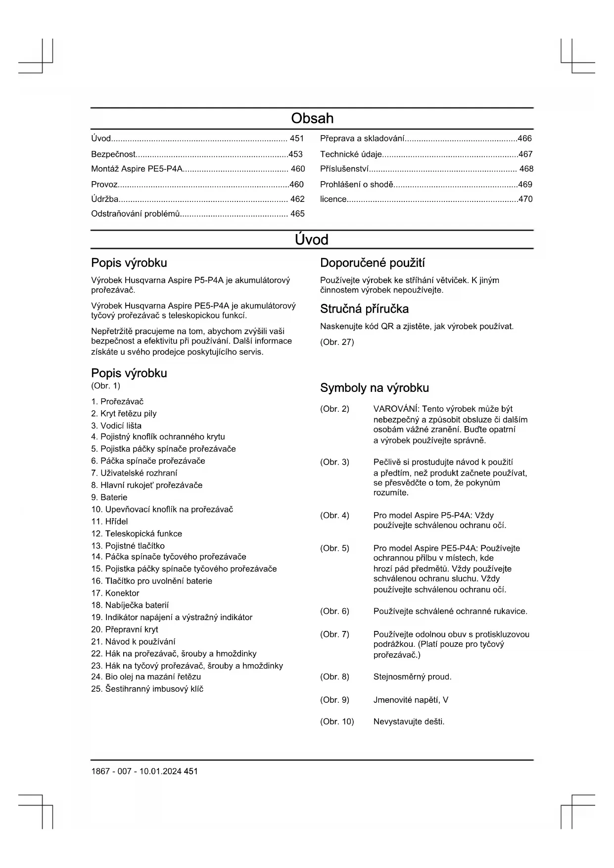 - licence Úvod Popis výrobku Výrobek Husqvarna Aspire P5-P4A je akumulátorový prořezávač. Výrobek Husqvarna Aspire PE5-P4A je akumulátorový tyčový prořezávač steleskopickou funkcí. Nepřetržitě pracujeme na tom, abychom zvýšili vaši bezpečnost a efektivitu při používání. Další informace získáte usvého prodejce poskytujícího servis. Doporučené použití Používejte výrobek ke stříhání větviček. Kjiným činnostem výrobek nepoužívejte. Stručná příručka Naskenujte kód QR azjistěte, jak výrobek používat. (Obr. 27) Popis výrobku (Obr. 1) p. 470