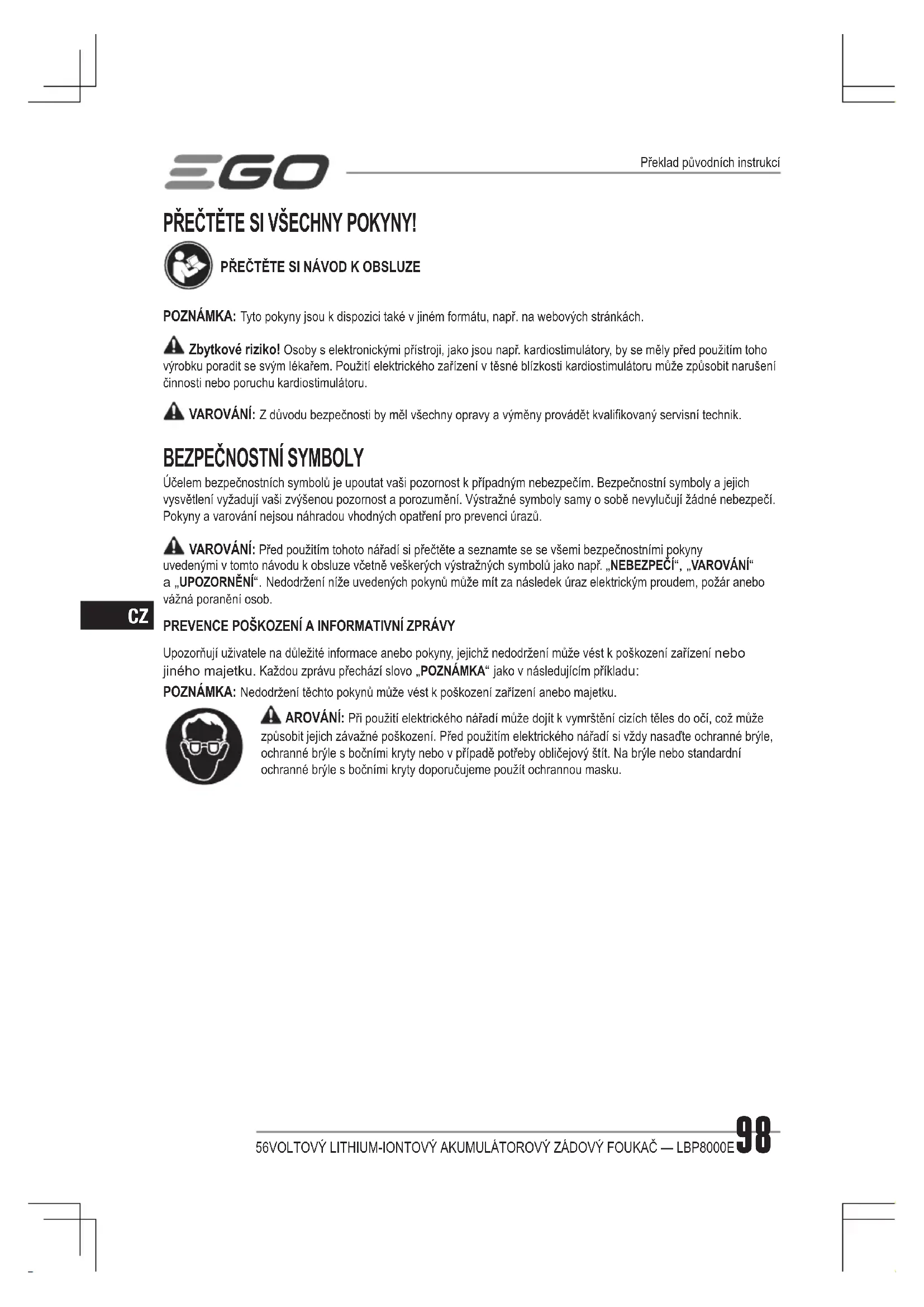Účelem bezpečnostních symbolů je upoutat vaši pozornost k případným nebezpečím. Bezpečnostní symboly a jejich vysvětlení vyžadují vaši zvýšenou pozornost a porozumění. Výstražné symboly samy o sobě nevylučují žádné nebezpečí. Pokyny a varování nejsou náhradou vhodných opatření pro prevenci úrazů. VAROVÁNÍ: Před použitím tohoto nářadí si přečtěte a seznamte se se všemi bezpečnostními pokyny uvedenými v tomto návodu k obsluze včetně veškerých výstražných symbolů jako např. „NEBEZPEČÍ“, „VAROVÁNÍ“ a „UPOZORNĚNÍ“. Nedodržení níže uvedených pokynů může mít za následek úraz elektrickým proudem, požár anebo vážná poranění osob. PREVENCE POŠKOZENÍ A INFORMATIVNÍ ZPRÁVY Upozorňují uživatele na důležité informace anebo pokyny, jejichž nedodržení může vést k poškození zařízení nebo jiného majetku. Každou zprávu přechází slovo „POZNÁMKA“ jako v následujícím příkladu: POZNÁMKA: Nedodržení těchto pokynů může vést k poškození zařízení anebo majetku. AROVÁNÍ: Při použití elektrického nářadí může dojít k vymrštění cizích těles do očí, což může způsobit jejich závažné poškození. Před použitím elektrického nářadí si vždy nasaďte ochranné brýle, ochranné brýle s bočními kryty nebo v případě potřeby obličejový štít. Na brýle nebo standardní ochranné brýle s bočními kryty doporučujeme použít ochrannou masku. Překlad původních instrukcí56VOLTOVÝ LITHIUM-IONTOVÝ AKUMULÁTOROVÝ ZÁDOVÝ FOUKAČ — LBP8000E 99