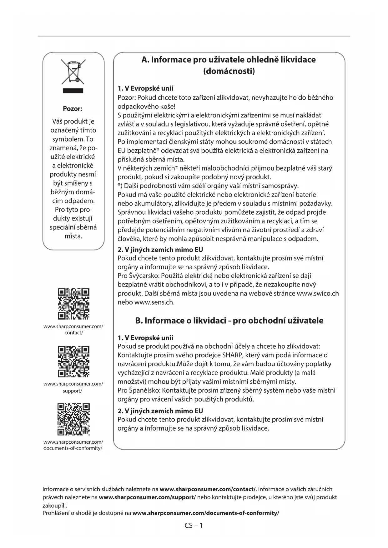 Pokud se produkt používá na obchodní účely a chcete ho zlikvidovat: Kontaktujte prosím svého prodejce SHARP, který vám podá informace o navrácení produktu.Může dojít k tomu, že vám budou účtovány poplatky vycházející z navrácení a recyklace produktu. Malé produkty (a malá množství) mohou být přijaty vašimi místními sběrnými místy. Pro Španělsko: Kontaktujte prosím zřízený sběrný systém nebo vaše místní orgány pro vrácení vašich použitých produktů.