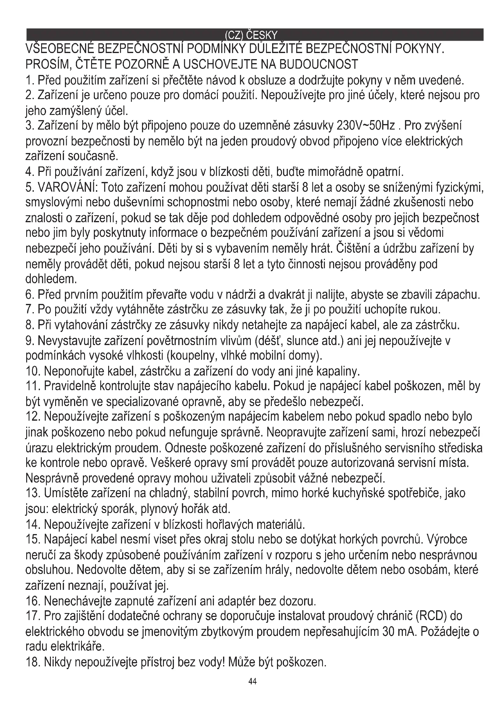 18. Nikdy nepoužívejte přístroj bez vody! Může být poškozen.