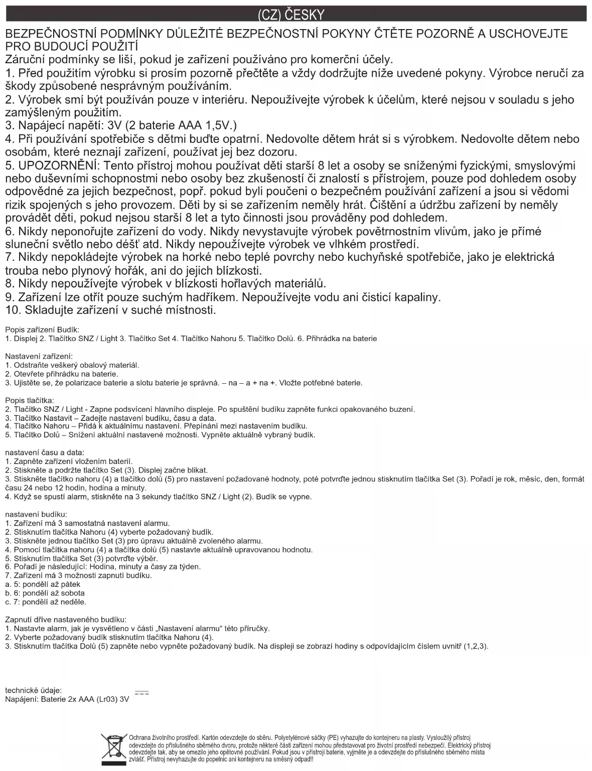 3. Stisknutím tlačítka Dolů (5) zapněte nebo vypněte požadovaný budík. Na displeji se zobrazí hodiny s odpovídajícím číslem uvnitř (1,2,3). technické údaje: Napájení: Baterie 2x AAA (Lr03) 3V Ochrana životního prostředí. Kartón odevzdejte do sběru. Polyetylénové sáčky (PE) vyhazujte do kontejneru na plasty. Vysloužilý přístroj odevzdejte do příslušného sběrného dvoru, protože některé části zařízení mohou představovat pro životní prostředí nebezpečí. Elektrický přístroj odevzdejte tak, aby se omezilo jeho opětovné používání. Pokud jsou v přístroji baterie, vyjměte je a odevzdejte do příslušného sběrného místa zvlášť. Přístroj nevyhazujte do popelnic ani kontejneru na směsný odpad!!(RU) РУССКИЙ(RU) РУССКИЙ BEZPEČNOSTNÍ PODMÍNKY DŮLEŽITÉ BEZPEČNOSTNÍ POKYNY ČTĚTE POZORNĚ A USCHOVEJTE