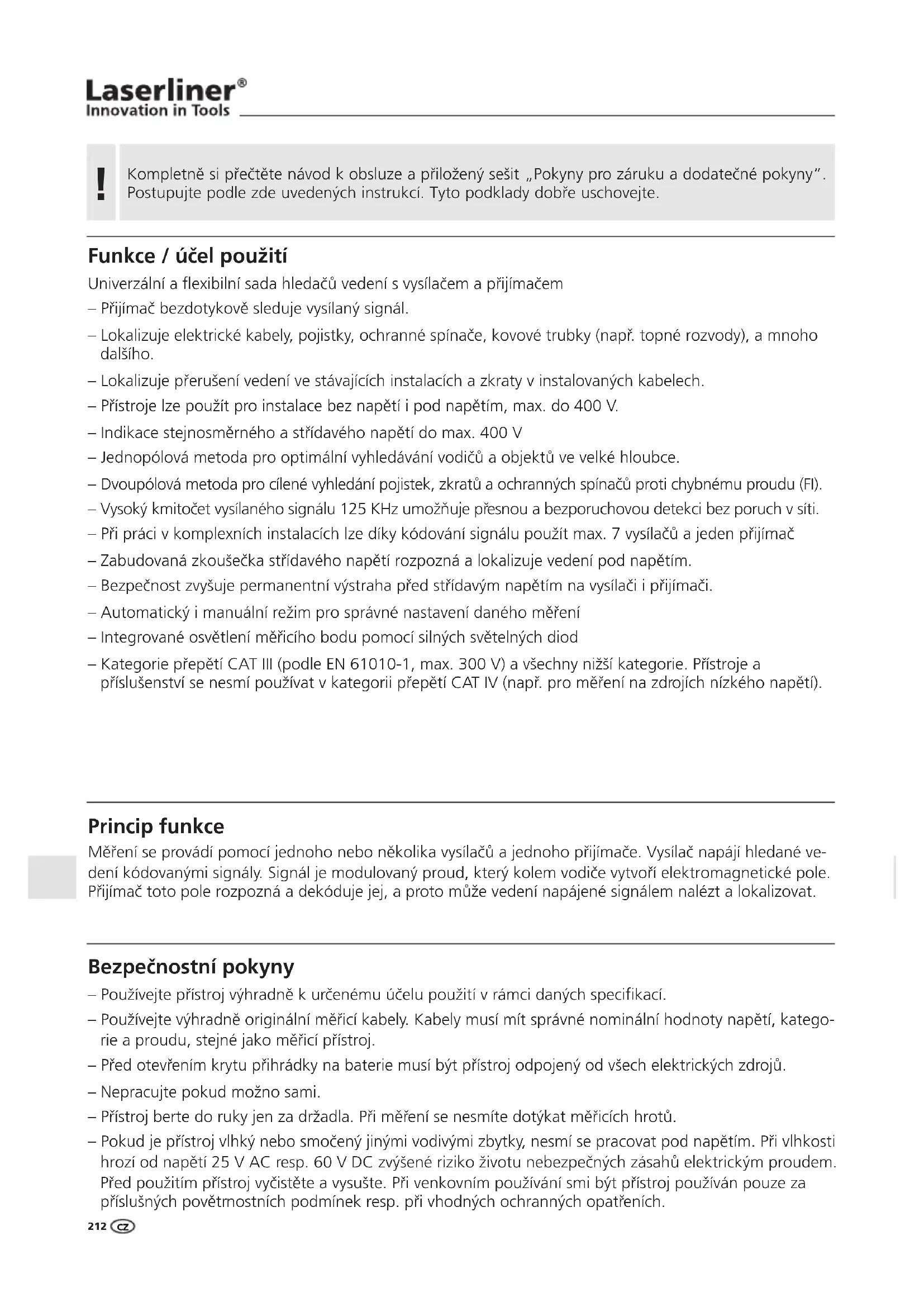 Manual_CableTracer-Pro_Rev.0710_UA.indd 211 02.09.2010 11:07:56 UhrKompletnŌ si pŪeňtŌte návod k obsluze a pŪiložený sešit „Pokyny pro záruku a dodateňné pokyny“. Postupujte podle zde uvedených instrukcí. Tyto podklady dobŪe uschovejte.