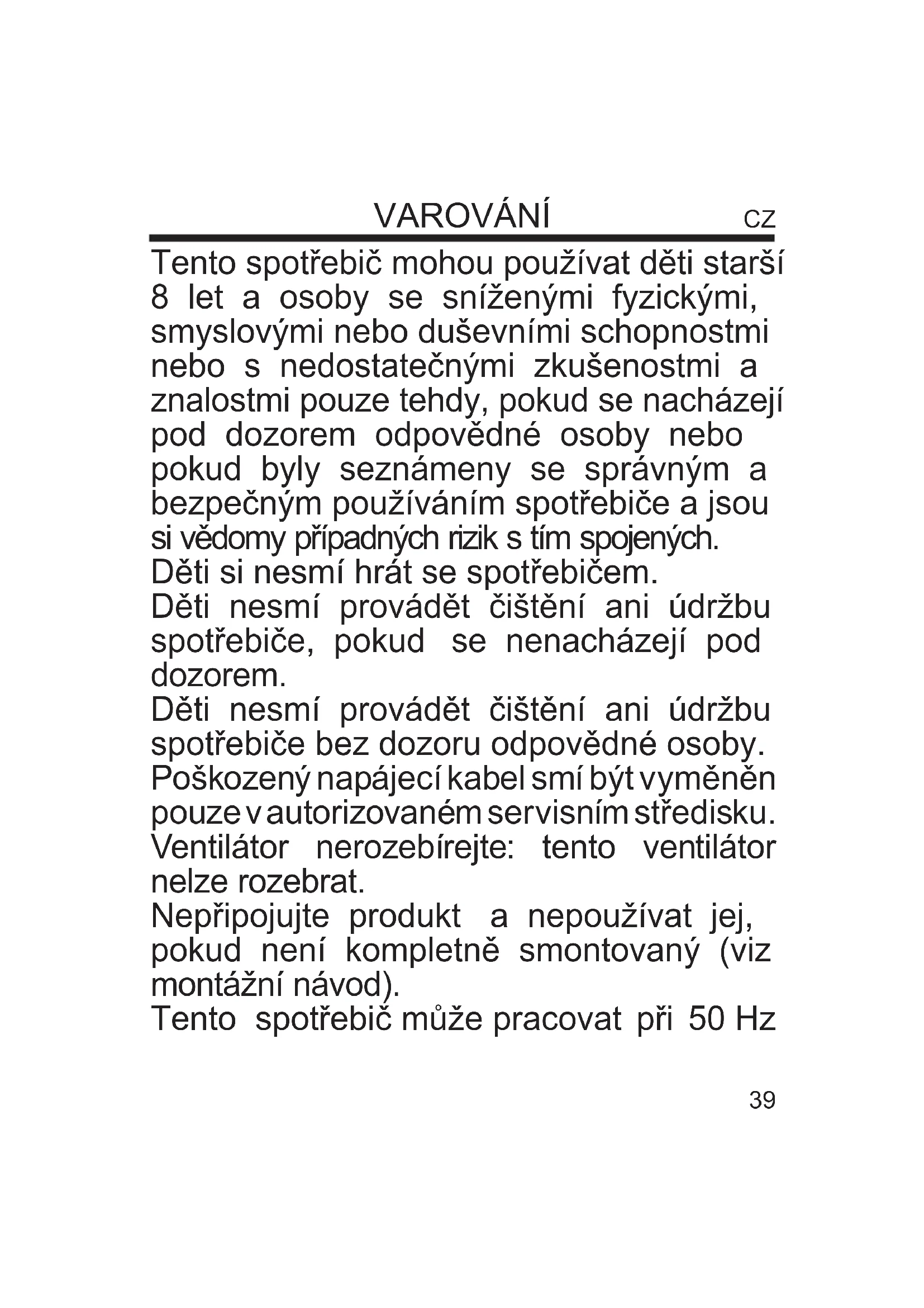 UPOZORNĚNÍ: Pečlivě si přečtěte tento návod k obsluze, který obsahuje důležité pokyny týkající se bezpečné instalace, použití a údržby spotřebiče. Uschovejte tento návod pro případné použití v budoucnu. Děti si nesmí hrát se spotřebičem. Tento spotřebič smí být používán pouze k účelům, ke kterým byl navržen; jakékoliv použití, které není v souladu s pokyny obsaženými v tomto návodu k obsluze, se považuje za nevhodné a nebezpečné. Výrobce nenese odpovědnost za možné škody způsobené nevhodným a/nebo nepřiměřeným použitím. Tento spotřebič NENÍ vhodný k použití v prostředí, kde hrozí nebezpečí výbuchu (tam, kde se vyskytují hořlavé látky, jako je plyn, pára, mlha nebo prach, za atmosférických podmínek, kdy se spaliny po zapálení šíří ve vzduchu). Obalové materiály (igelitové sáčky, polystyren atd.) musíte uchovávat mimo dosah dětí nebo zdravotně postižených osob, protože představují potenciální zdroj nebezpečí. Instalace/montáž spotřebiče musí být provedena podle pokynů výrobce. Špatný postup může způsobit poranění osob či zvířat nebo poškození předmětů, za které výrobce nenese žádnou odpovědnost. Umístěte spotřebič na horizontální a stabilní povrch. Před prvním použitím spotřebiče zkontrolujte, zda nedošlo k poškození napájecího kabelu nebo samotného spotřebiče během přepravy. Pokud si nejste jistí, obraťte se na kvalikovanou osobu. Před prvním připojením spotřebiče k elektrické síti se ujistěte, že jmenovitý výkon (napětí a frekvence) spotřebiče odpovídá Vaší elektrické síti a že zásuvka je vhodná pro zástrčku spotřebiče. Ujistěte se, že napájecí systém je vybaven vhodnou ochranou podle platných zákonů. NEPŘIPOJUJTE spotřebič k vícenásobné zásuvce. Pokud je to možné, vyvarujte se použití adaptérů a/nebo prodlužovacích kabelů; pokud je jejich použití naprosto nezbytné, používejte pouze materiály, které odpovídají současným bezpečnostním předpisům a vyhovují elektrickým parametrům spotřebiče. Nepoužívejte spotřebič spolu s externím časovačem a/nebo jiným zařízením dálkového ovládání, které není doporučeno v tomto návodu nebo 60 Hz bez nutnosti úprav.41 k použití. NEPOUŽÍVEJTE spotřebič ani ho neskladujte v blízkosti tepelných zdrojů (ohřívačů, kamen atd.). NIKDY neponořujte spotřebič do vody nebo jiných kapalin; pokud dojde k náhodnému pádu do vody, NEPOKOUŠEJTE se spotřebič vytáhnout z vody, nýbrž nejprve vytáhněte síťovou zástrčku ze zásuvky. Před prvním použitím spotřebiče nezapomeňte odstranit veškeré štítky nebo ochranné fólie, které brání ve správném fungování spotřebiče. Zapojujte a odpojujte napájecí kabel suchýma rukama a držte ho přitom pevně. Před připojením spotřebiče k elektrické síti se ujistěte, že se tlačítko startu spotřebiče nachází v poloze “OFF” (vypnuto). Vždy odpojte napájecí kabel, abyste zabránili přehřátí spotřebiče. Netahejte za napájecí kabel (netahejte za kabel, neodpojujte spotřebič od elektrické sítě ani ho nepřemísťujte tahem za kabel). Neveďte napájecí kabel po drsném nebo ostrém povrchu nebo místy, kde by mohlo dojít k jeho poškození. NEBLOKUJTE zcela ani zčásti ventilační otvory spotřebiče ani do nich nevkládejte žádné předměty. Během provozu se nedotýkejte spotřebiče mokrými částmi těla. V každém případě Vám doporučujeme mít mezi sebou a stojanem spotřebiče izolační prvek (např. nosit obuv s gumovou podrážkou). Během používání musíte udržovat spotřebič v bezpečné vzdálenosti od jakéhokoliv předmětu a/nebo hořlavých či potenciálně výbušných látek. V případě poruchy nebo neobvyklého chování během provozu okamžitě vypněte spotřebič, odpojte ho od elektrické sítě a zjistěte příčinu poruchy. Pokud je to možné, obraťte se na kvalikovanou osobu. Neprovádějte úkony, které nejsou uvedeny v tomto návodu k obsluze (například demontáž a/nebo úpravy spotřebiče). Pokud spotřebič nebudete delší dobu používat, chcete ho uložit, vyčistit nebo provést jakoukoliv údržbu, odpojte ho nejprve od elektrické sítě. Uchovávejte a používejte spotřebič pouze v interiéru nebo v prostoru chráněném před povětrnostními vlivy, jako je např. déšť, přímé sluneční záření nebo prach. Spotřebič není určen k použití nebo skladování v exteriéru. Děti NESMÍ provádět čištění ani údržbu spotřebiče bez dozoru dospělé osoby. Před vytažením zástrčky ze zásuvky nejprve vypněte spotřebič stiskem správného tlačítka na ovládacím panelu. NEZAVĚŠUJTE ventilátor na stěnu nebo strop, pokud tento typ instalace není uveden a popsán v tomto návodu k obsluze. Umístěte spotřebič ve správné vzdálenosti od předmětů nebo okolních stěn. Ujistěte se, že jeho provoz nepovede k náhodným škodám. NEPOUŽÍVEJTE spotřebič v blízkosti plynových sporáků nebo42 otevřeného ohně. NEPOUŽÍVEJTE spotřebič v blízkosti závěsů nebo textilií. NEZAVĚŠUJTE ventilátor na stěnu nebo strop, pokud tento typ instalace není uveden a popsán v tomto návodu k obsluze. NEZAKRÝVEJTE spotřebič během provozu. NEVKLÁDEJTE dovnitř ochranné mřížky ventilátoru žádné předměty ani části těla. NENECHÁVEJTE spotřebič během provozu delší dobu bez dozoru. NEVYSTAVUJTE SE delší dobu proudění vzduchu, které vzniká provozem ventilátoru, neboť by mohlo dojít k poškození zdraví. Pokud ventilátor delší dobu nebudete používat nebo ho nepoužíváte pravidelně, umístěte ho do původního obalu a skladujte ho na suchém místě. Před prvním použitím ventilátoru po dlouhé době nečinnosti se ujistěte, že je ventilátor čistý a jeho lop