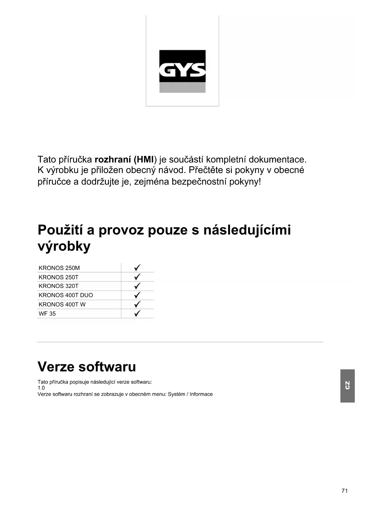 Tato příručka rozhraní (HMI) je součástí kompletní dokumentace. K výrobku je přiložen obecný návod. Přečtěte si pokyny v obecné příručce a dodržujte je, zejména bezpečnostní pokyny! Použití a provoz pouze s následujícími výrobky KRONOS 250M KRONOS 250T KRONOS 320T
