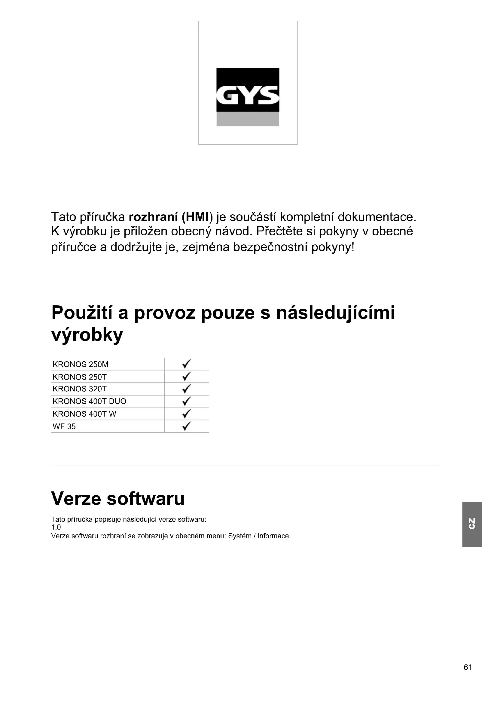 Tato příručka rozhraní (HMI) je součástí kompletní dokumentace. K výrobku je přiložen obecný návod. Přečtěte si pokyny v obecné příručce a dodržujte je, zejména bezpečnostní pokyny! Použití a provoz pouze s následujícími výrobky KRONOS 250M KRONOS 250T KRONOS 320T