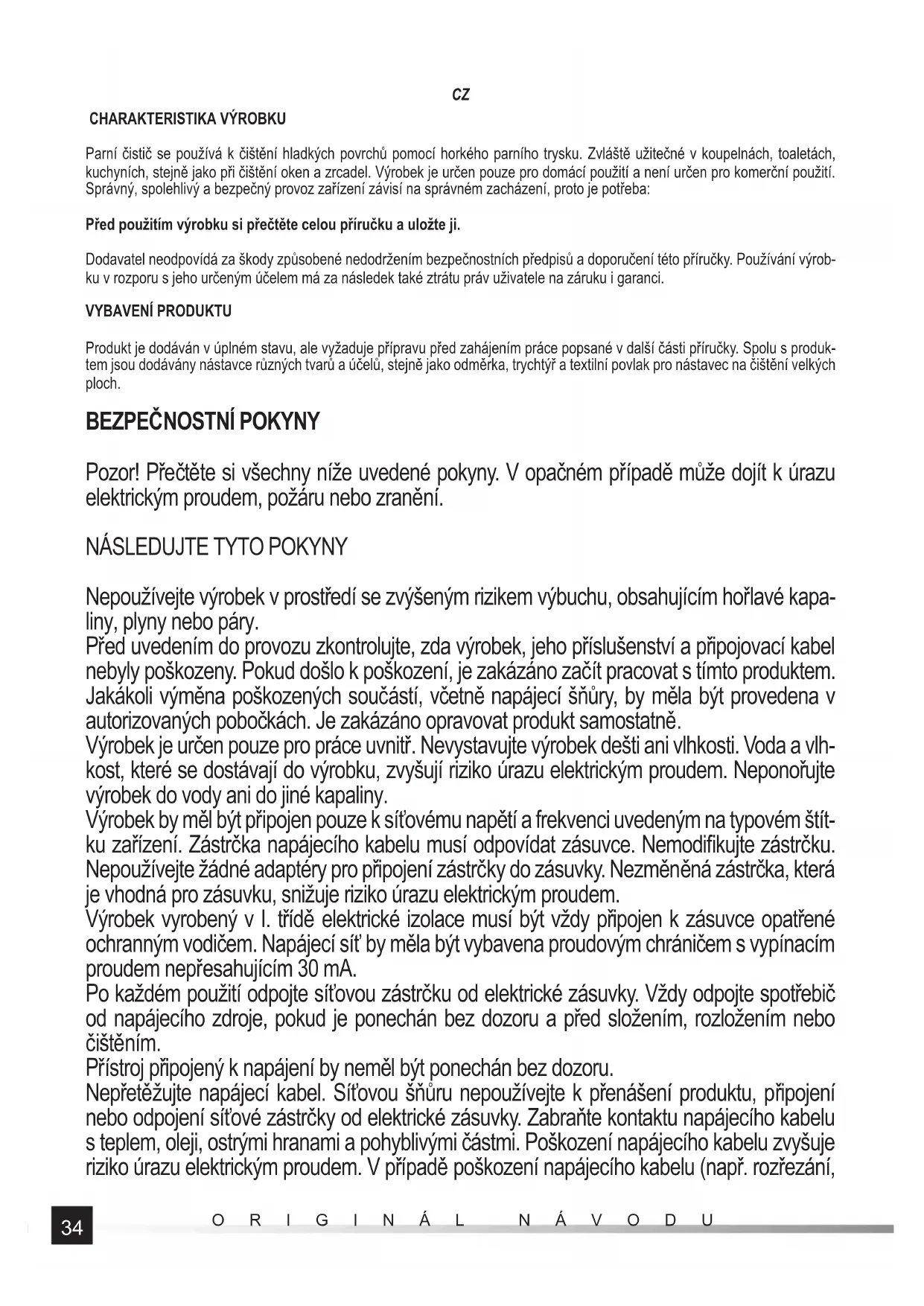 Parní čistič se používá k čištění hladkých povrchů pomocí horkého parního trysku. Zvláště užitečné v koupelnách, toaletách, kuchyních, stejně jako při čištění oken a zrcadel. Výrobek je určen pouze pro domácí použití a není určen pro komerční použití. Správný, spolehlivý a bezpečný provoz zařízení závisí na správném zacházení, proto je potřeba: Před použitím výrobku si přečtěte celou příručku a uložte ji. Dodavatel neodpovídá za škody způsobené nedodržením bezpečnostních předpisů a doporučení této příručky. Používání výrob- ku v rozporu s jeho určeným účelem má za následek také ztrátu práv uživatele na záruku i garanci. VYBAVENÍ PRODUKTU Produkt je dodáván v úplném stavu, ale vyžaduje přípravu před zahájením práce popsané v další části příručky. Spolu s produk- tem jsou dodávány nástavce různých tvarů a účelů, stejně jako odměrka, trychtýř a textilní povlak pro nástavec na čišt ění velkých ploch.