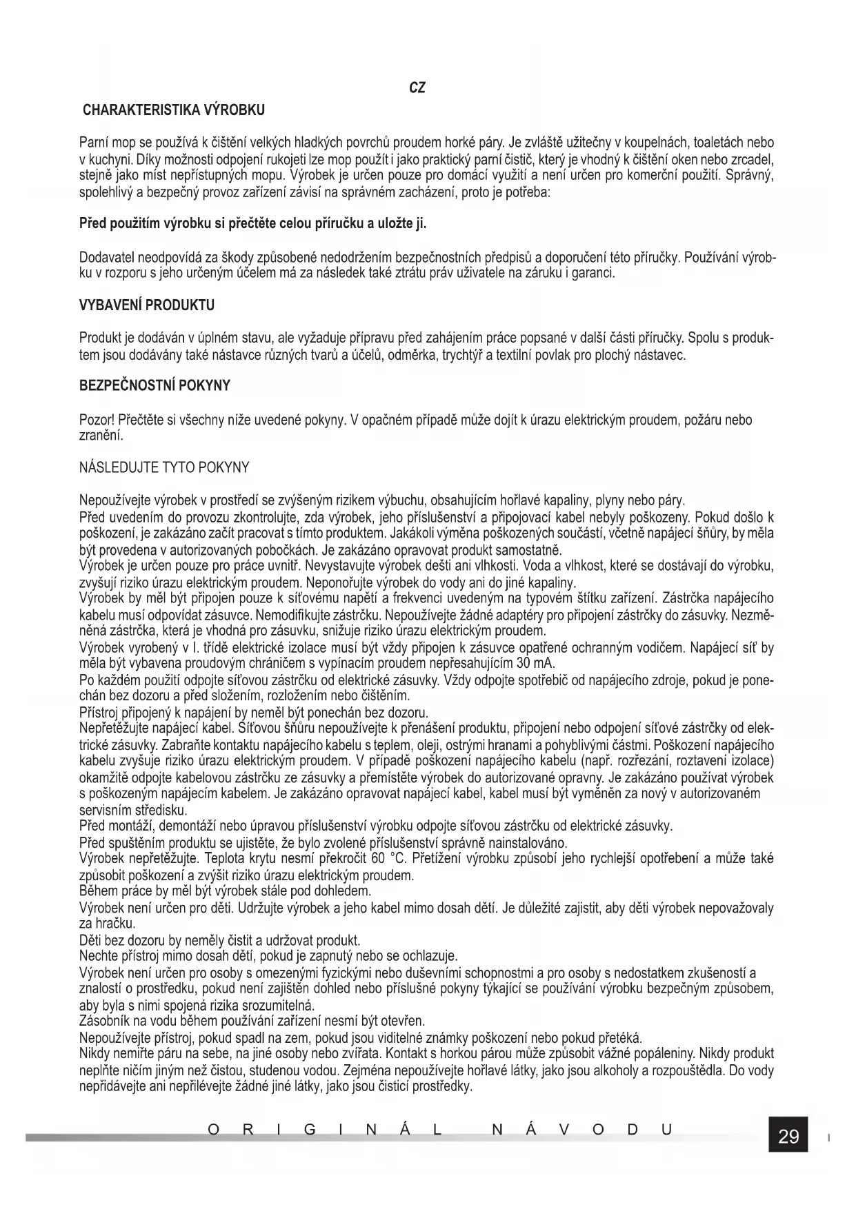 Nepoužívejte výrobek v prostředí se zvýšeným rizikem výbuchu, obsahujícím hořlavé kapaliny, plyny nebo páry. Před uvedením do provozu zkontrolujte, zda výrobek, jeho příslušenství a připojovací kabel nebyly poškozeny. Pokud došlo k poškození, je zakázáno začít pracovat s tímto produktem. Jakákoli výměna poškozených součástí, včetně napájecí šňůry, by měla být provedena v autorizovaných pobočkách. Je zakázáno opravovat produkt samostatně. Výrobek je určen pouze pro práce uvnitř. Nevystavujte výrobek dešti ani vlhkosti. Voda a vlhkost, které se dostávají do výrobku, zvyšují riziko úrazu elektrickým proudem. Neponořujte výrobek do vody ani do jiné kapaliny. Výrobek by měl být připojen pouze k síťovému napětí a frekvenci uvedeným na typovém štítku zařízení. Zástrčka napájecího kabelu musí odpovídat zásuvce. Nemodifi kujte zástrčku. Nepoužívejte žádné adaptéry pro připojení zástrčky do zásuvky. Nezmě- něná zástrčka, která je vhodná pro zásuvku, snižuje riziko úrazu elektrickým proudem. Výrobek vyrobený v I. třídě elektrické izolace musí být vždy připojen k zásuvce opatřené ochranným vodičem. Napájecí síť by měla být vybavena proudovým chráničem s vypínacím proudem nepřesahujícím 30 mA. Po každém použití odpojte síťovou zástrčku od elektrické zásuvky. Vždy odpojte spotřebič od napájecího zdroje, pokud je pone- chán bez dozoru a před složením, rozložením nebo čištěním. Přístroj připojený k napájení by neměl být ponechán bez dozoru. Nepřetěžujte napájecí kabel. Síťovou šňůru nepoužívejte k přenášení produktu, připojení nebo odpojení síťové zástrčky od elek- trické zásuvky. Zabraňte kontaktu napájecího kabelu s teplem, oleji, ostrými hranami a pohyblivými částmi. Poškození napájecího kabelu zvyšuje riziko úrazu elektrickým proudem. V případě poškození napájecího kabelu (např. rozřezání, roztavení izolace) okamžitě odpojte kabelovou zástrčku ze zásuvky a přemístěte výrobek do autorizované opravny. Je zakázáno používat výrobek s poškozeným napájecím kabelem. Je zakázáno opravovat napájecí kabel, kabel musí být vyměněn za nový v autorizovaném servisním středisku. Před montáží, demontáží nebo úpravou příslušenství výrobku odpojte síťovou zástrčku od elektrické zásuvky. Před spuštěním produktu se ujistěte, že bylo zvolené příslušenství správně nainstalováno. Výrobek nepřetěžujte. Teplota krytu nesmí překročit 60 °C. Přetížení výrobku způsobí jeho rychlejší opotřebení a může také způsobit poškození a zvýšit riziko úrazu elektrickým proudem. Během práce by měl být výrobek stále pod dohledem. Výrobek není určen pro děti. Udržujte výrobek a jeho kabel mimo dosah dětí. Je důležité zajistit, aby děti výrobek nepovažovaly za hračku. Děti bez dozoru by neměly čistit a udržovat produkt. Nechte přístroj mimo dosah dětí, pokud je zapnutý nebo se ochlazuje. Výrobek není určen pro osoby s omezenými fyzickými nebo duševními schopnostmi a pro osoby s nedostatkem zkušeností a znalostí o prostředku, pokud není zajištěn dohled nebo příslušné pokyny týkající se používání výrobku bezpečným způsobem, aby byla s nimi spojená rizika srozumitelná. Zásobník na vodu během používání zařízení nesmí být otevřen. Nepoužívejte přístroj, pokud spadl na zem, pokud jsou viditelné známky poškození nebo pokud přetéká. Nikdy nemiřte páru na sebe, na jiné osoby nebo zvířata. Kontakt s horkou párou může způsobit vážné popáleniny. Nikdy produkt neplňte ničím jiným než čistou, studenou vodou. Zejména nepoužívejte hořlavé látky, jako jsou alkoholy a rozpouštědla. Do vody nepřidávejte ani nepřilévejte žádné jiné látky, jako jsou čisticí prostředky.30