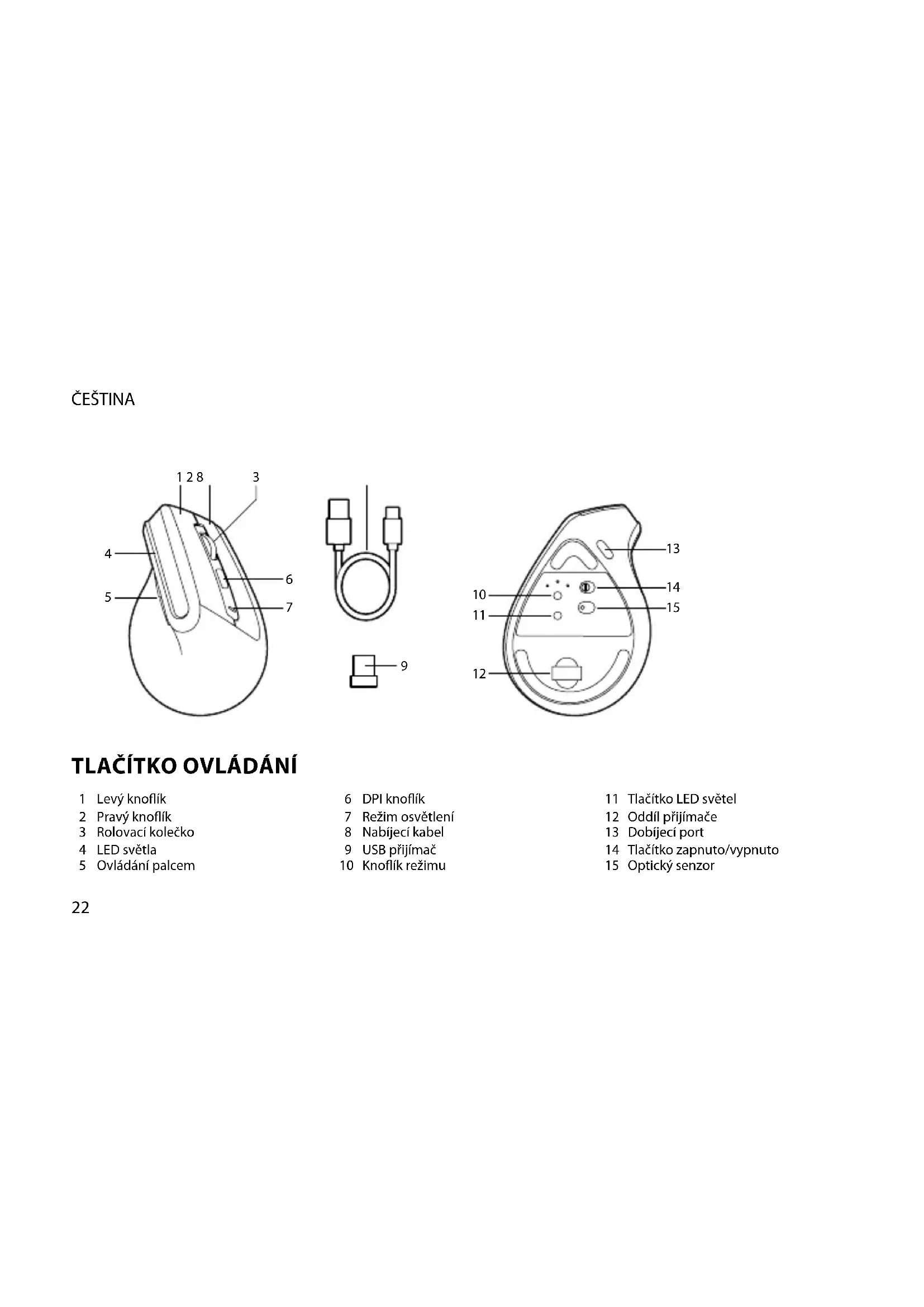 Tlačítko LED světel Oddíl přijímače Dobíjecí port Tlačítko zapnuto/vypnuto Optický senzor